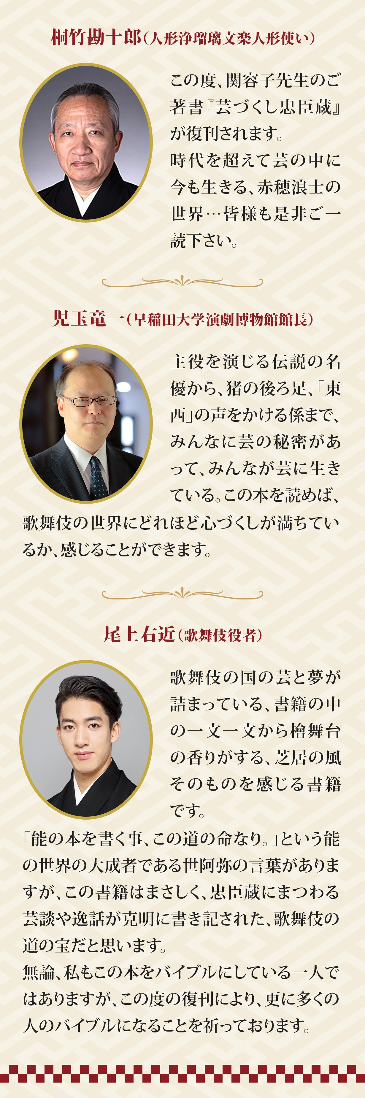 特に今、歌舞伎が若い世代に見直されているこの好機に『芸づくし忠臣蔵』という名著を復刊し、より多くの方々にお届けしたいと考えております。