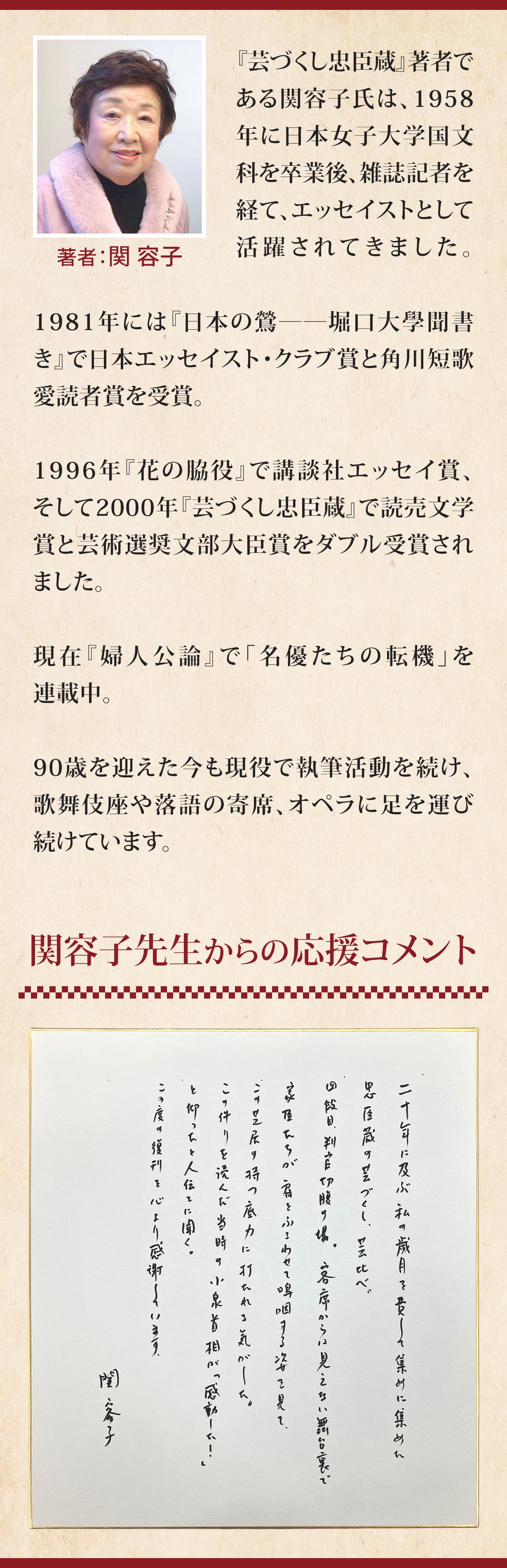 この絶好の機会に、歌舞伎界で知らない人はいないエッセイスト・関容子氏の名著『芸づくし忠臣蔵』を復刊し、より多くの方々にお届けしたいと考えております。