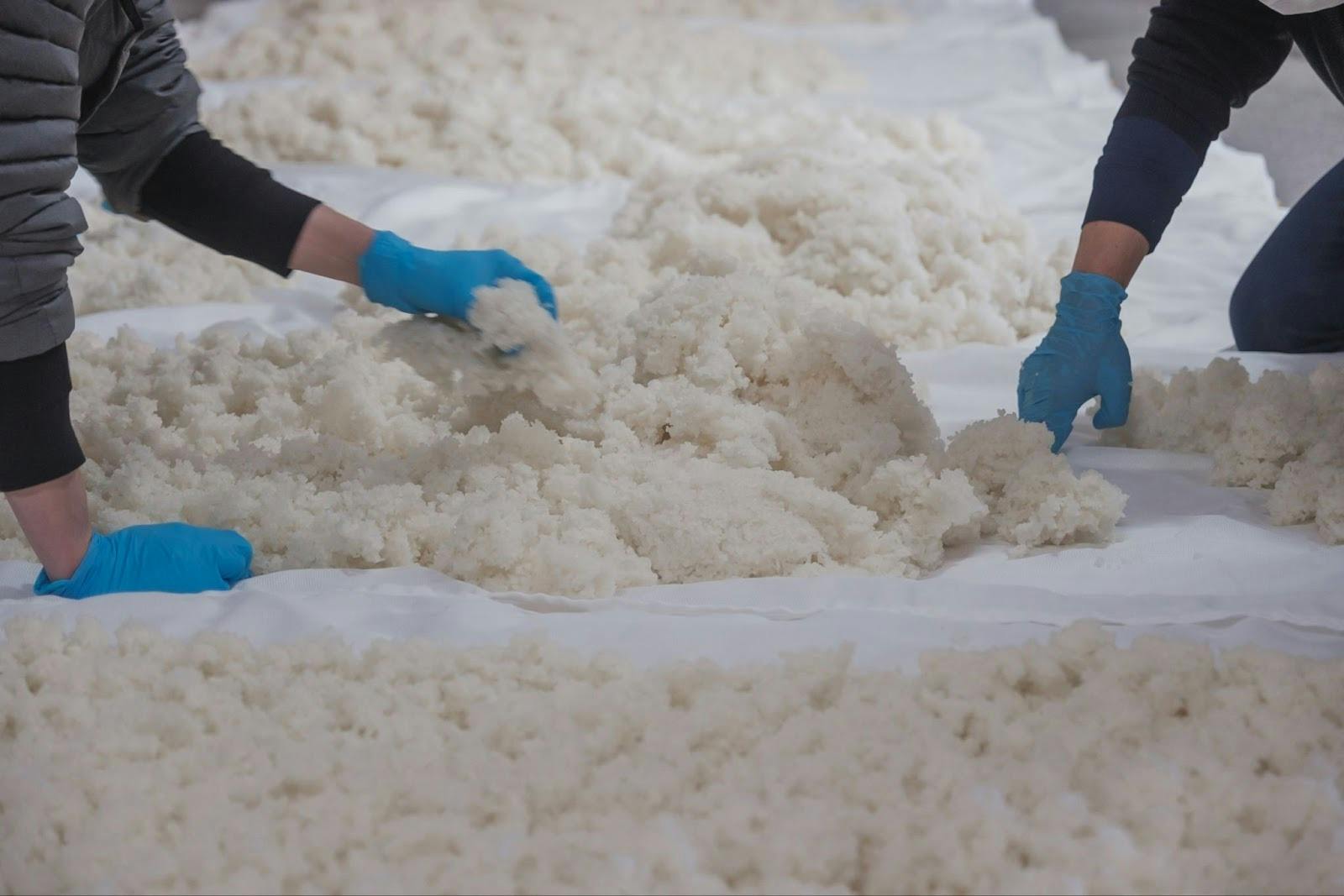 現在は放冷機(簡易放冷機や連続式放冷機)を使った強制冷却が主流となっていますが、水口酒造では設備がないため、布の上に蒸し米を広げて自然に冷ます方法で行っています。