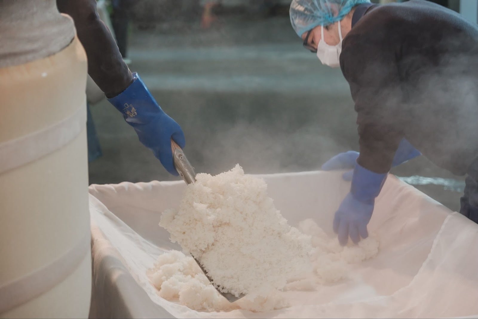 蒸米は時間が経つにつれて米が冷えて固くなっていくため、手早く広げる必要があります。固まりのまま放置すればするほど蒸米の内側と外側の温度差ができてしまい、洗米時の徹底した温度・吸水管理が水の泡となってしまうため一定のスピード感で蒸米を広げて均一に冷ましていくことが重要です。
