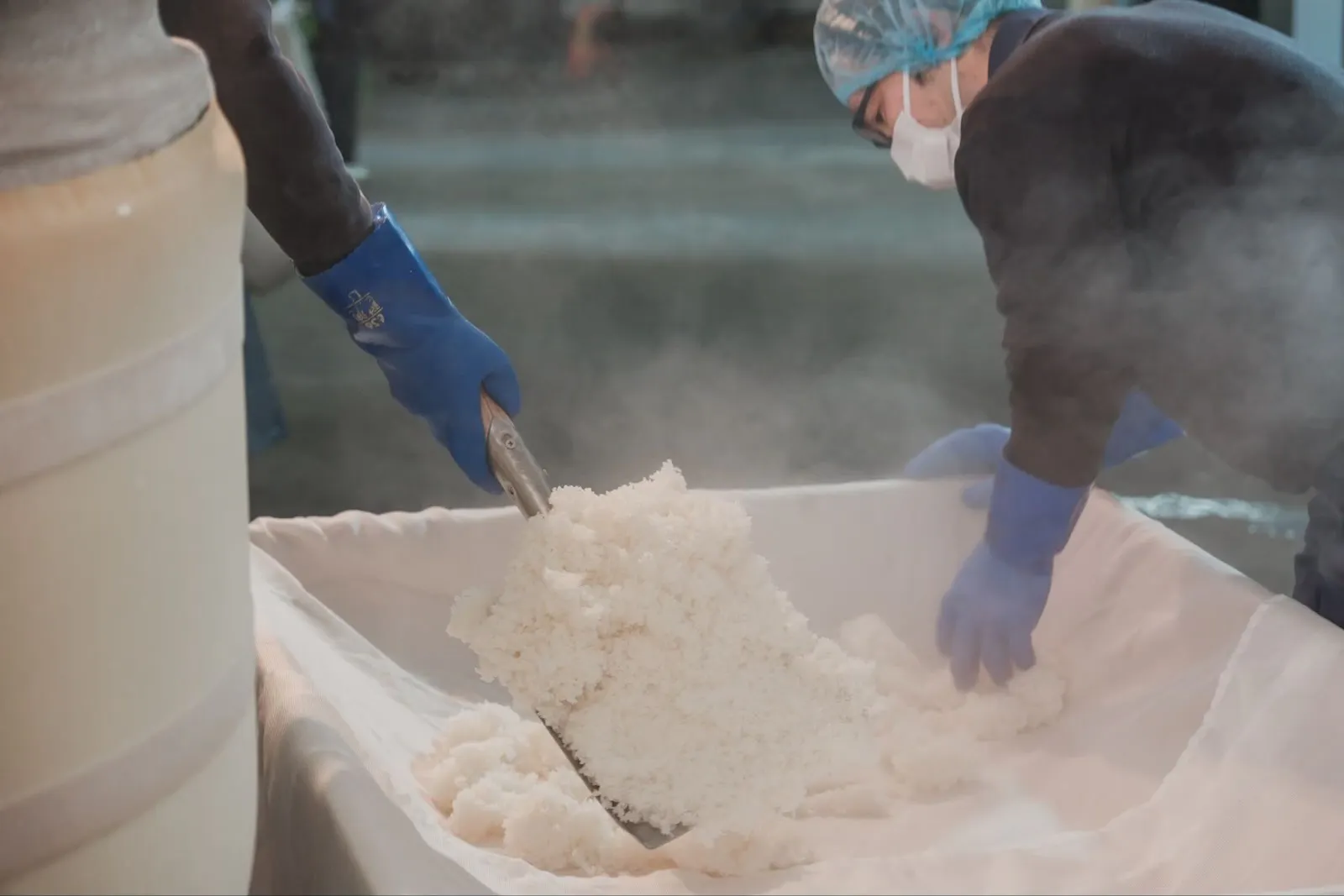 甑から専用のスコップで米を掘り出す者、掘り出された米を運ぶ者、運ばれた米を広げるもの、3者の息を合わせて作業を進める必要があります。酒造りはまさにチームワークですね!