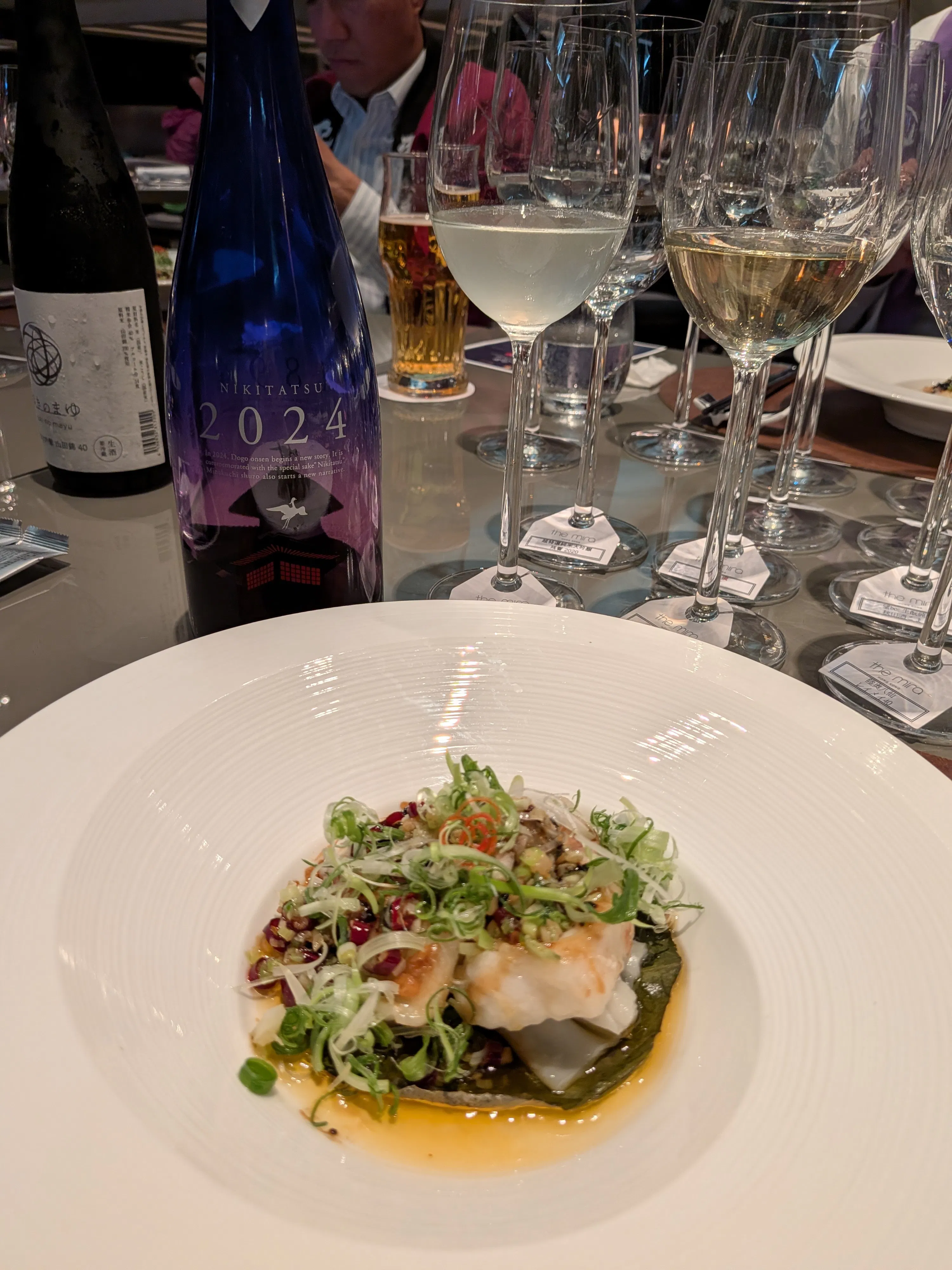 香港料理に各地の酒を1品ずつペアリングされたオリジナルメニューがふるまわれました。水口酒造は「NIKITATSU2024 仁喜多津 純米大吟醸酒」とのマッチングとして、白身魚にネギとナッツの甘辛ソースをかけたお料理(スパイシーな中にも特有の甘さがあり非常に美味しかったです!)をご用意いただき、大変好評でした。