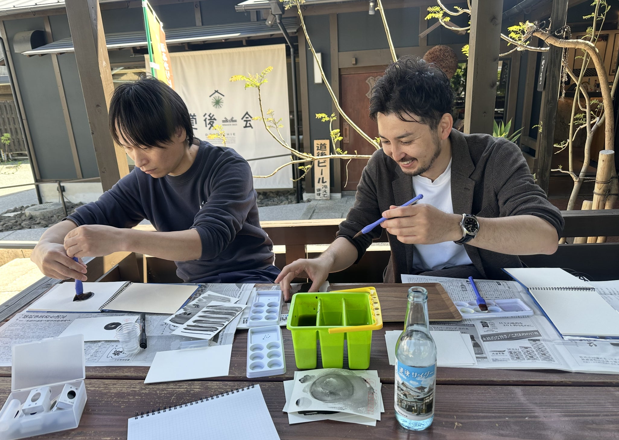 描いて終わりではなく、筆の滲み、力の強弱、濃度、色の混ざり、色合いを一つずつ深掘りし、「なぜその表現になったのか」「どこがその酒らしいのか」を問い直しながら、杜氏・蔵元のイメージやこだわりを言語化しました。