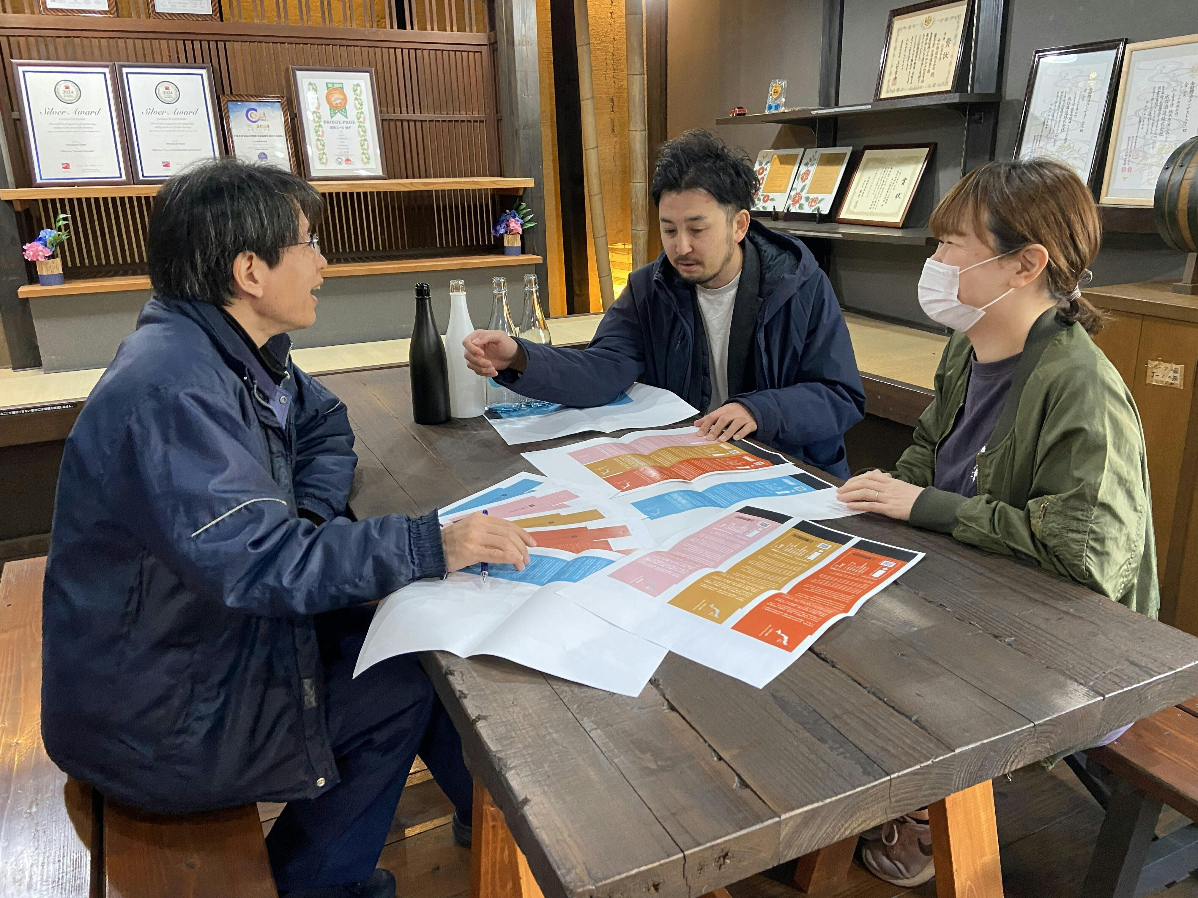 2025/12/29 11:30磨き直しを進めてきた過程を振り返る中で、改めて印象に残っている2025年初夏の蔵での取り組みを紹介します。磨き直しが決まった時点で、クリエイティブディレクター / デザイナーは何日も現地を歩き回り、水口酒造・仁喜多津について長時間のヒアリングを行ってきました。しかし、酒の魅力の中には言葉だけでは説明しきれない部分があります。そこでこの日は、仁喜多津らしさと、各酒が持つ味の違いについて、しっくりくるキーワードと感覚を徹底的に引き出すことを目的にワークを行いました。言葉中心ではなく感覚をそのまま出すため、描く前に必ずその酒を飲み、香り・口当たり・余韻などの感覚が残っているうちに手を動かしてもらいました。1)白黒+丸だけで表現する 2)一筆だけで表現する 3)カラーで表現する という3つのワークで表現していきます。描いて終わりではなく、筆の滲み、力の強弱、濃度、色の混ざり、色合いを一つずつ深掘りし、「なぜその表現になったのか」「どこがその酒らしいのか」を問い直しながら、杜氏・蔵元のイメージやこだわりを言語化しました。今振り返ると、「この酒をどう受け取ってほしいか」という造り手の意志を、飲み手の体験につながる形に整えていく工程だったように思います。得られたイメージは、味わいごとのボトルパターンや、仁喜多津全体のコンセプトを磨き上げる作業にも反映しています。今後も、こうした積み重ねを活動報告でお届けしていきます。どうぞ引き続き応援よろしくお願いいたします! もっと見る