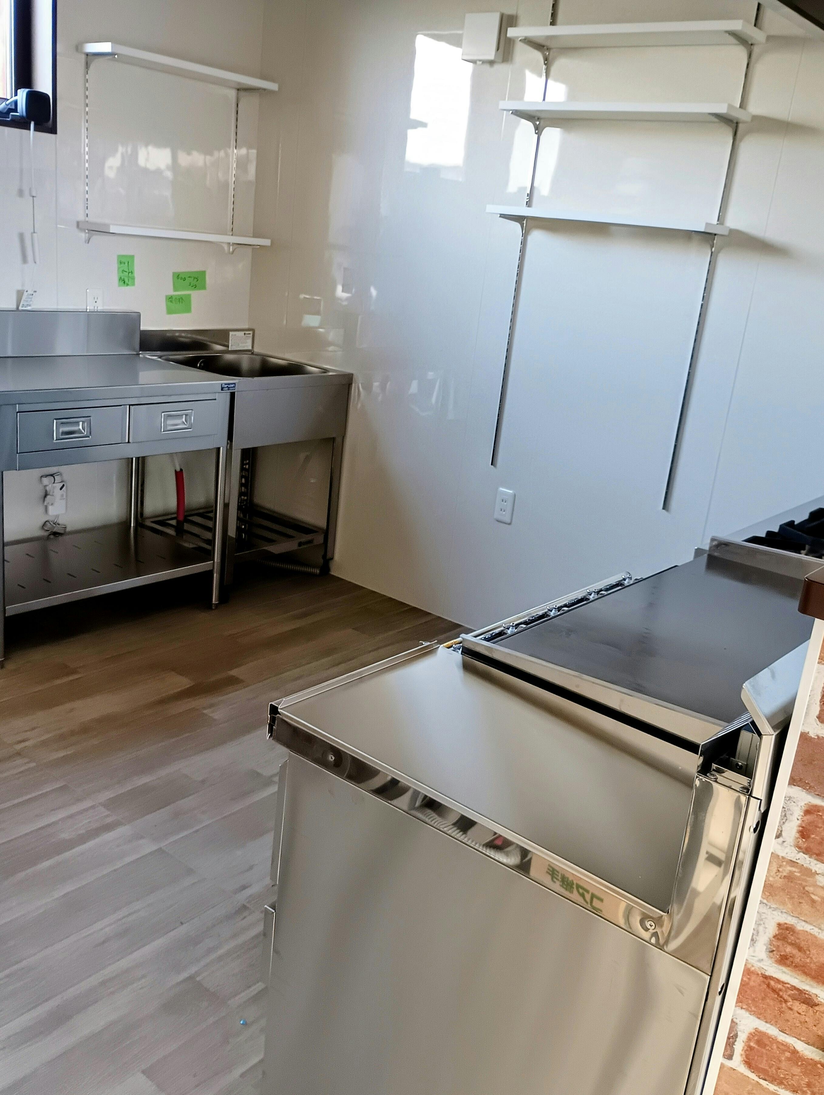 さて、今回はカフェの一部をお見せしたいと思います。昨日、厨房設備が届き現在設置中です。