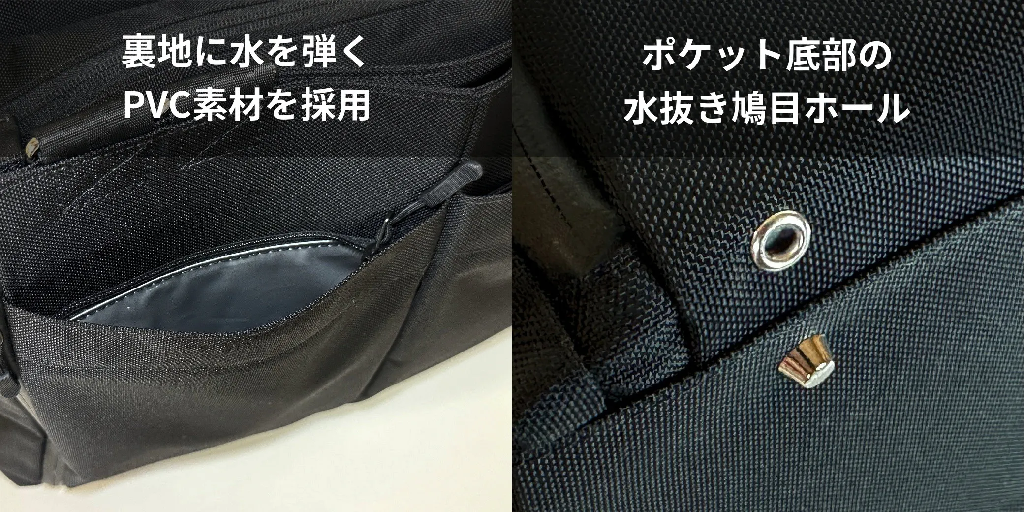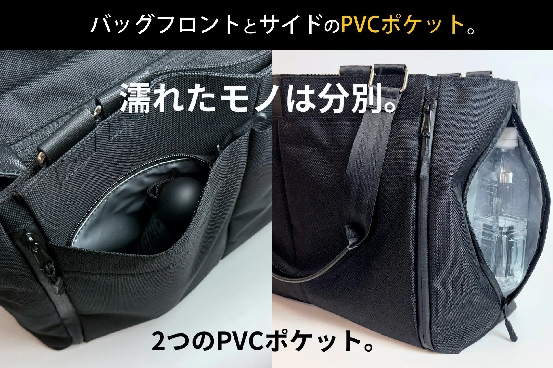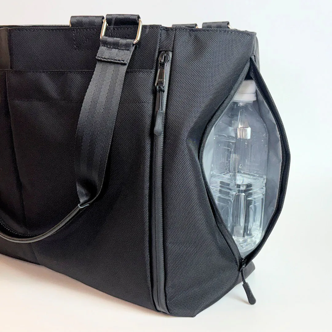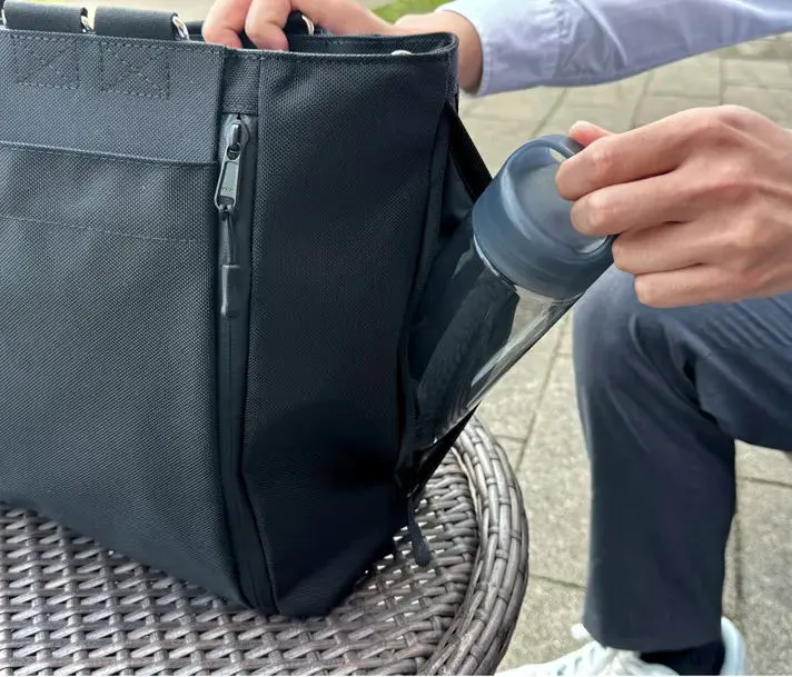 バッグの片方の側面に、水を弾くPVCライニングを採用したファスナーポケットを装備しました。濡れたボトルや折りたたみ傘の収納に便利です。