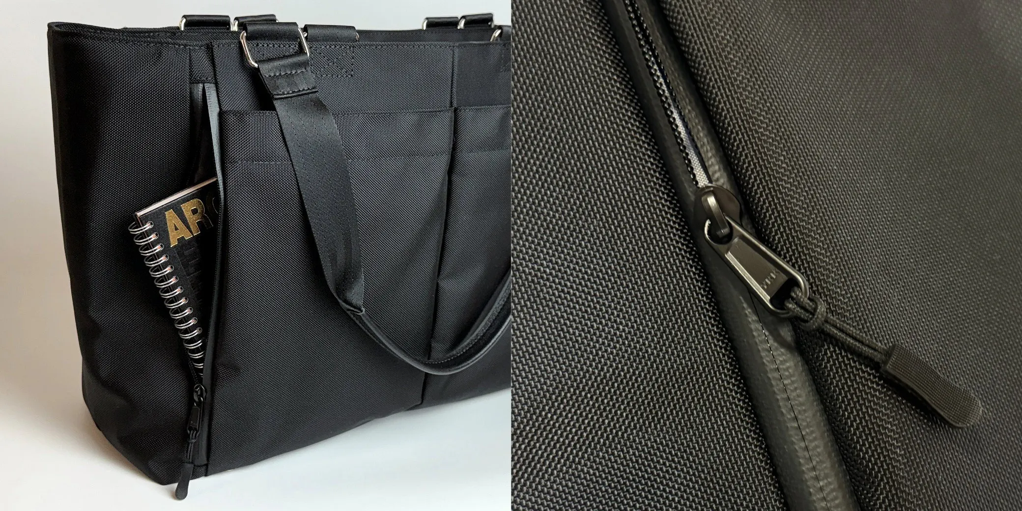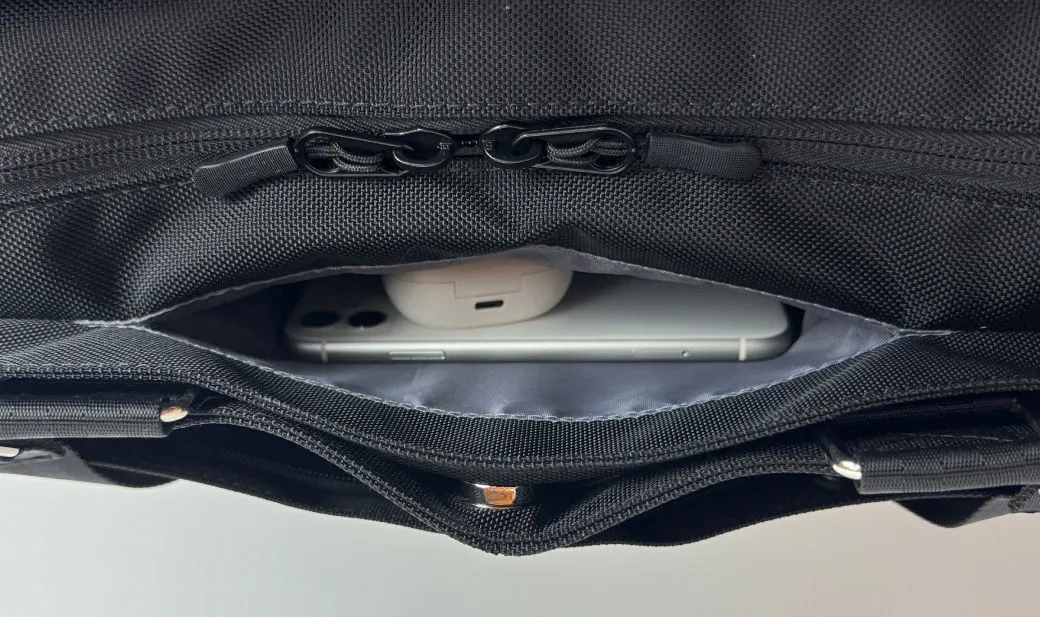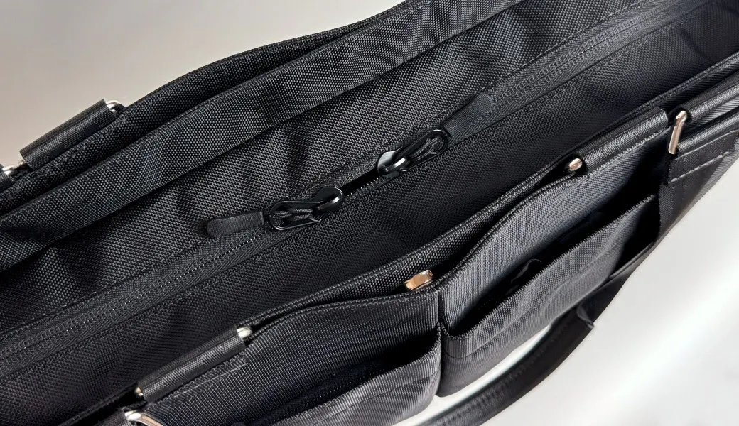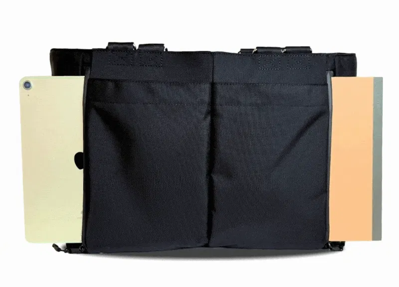 この2層目には、iPad Air 11インチやB5サイズ(182mm×257mm)が入るポケットを左右に付けました。このポケットは、YKK製の止水ファスナーを採用しました。