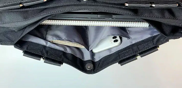 この3層目にあるスペースは、マグネット開閉でスムーズにアクセスが可能なポケットです。メイン収納を開けずにサッと取り出したい13インチPCやA4ファイルの収納が可能です。