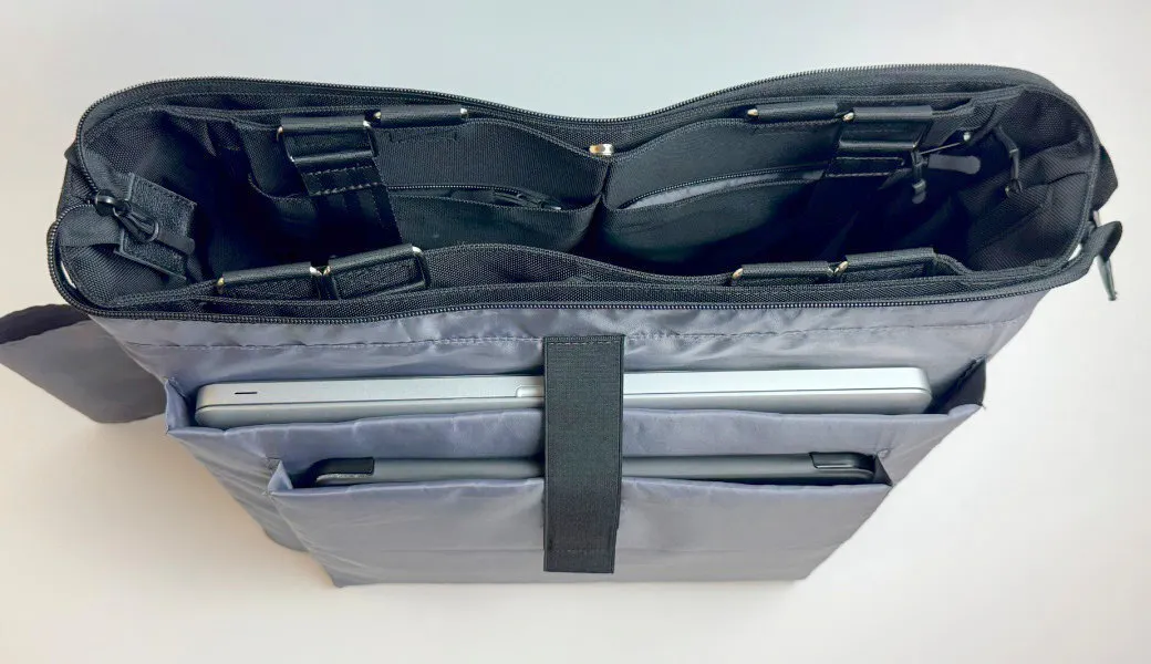 メイン収納には、16インチPCと13インチのタブレットが入るウレタン補強された専用保護ポケットを付けました。