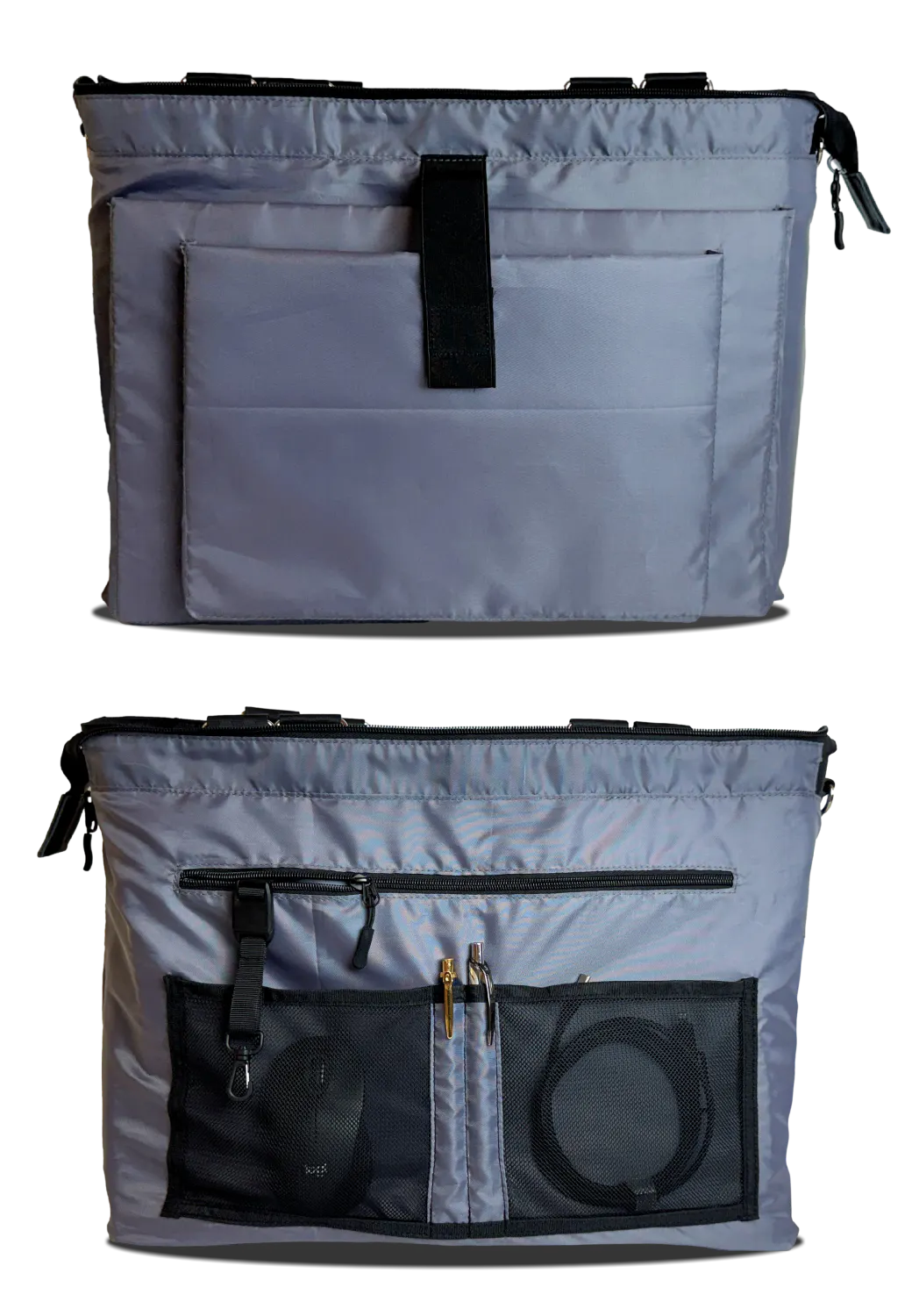 メイン収納には左右どちらからも開閉しやすいようダブルファスナーを採用しました。