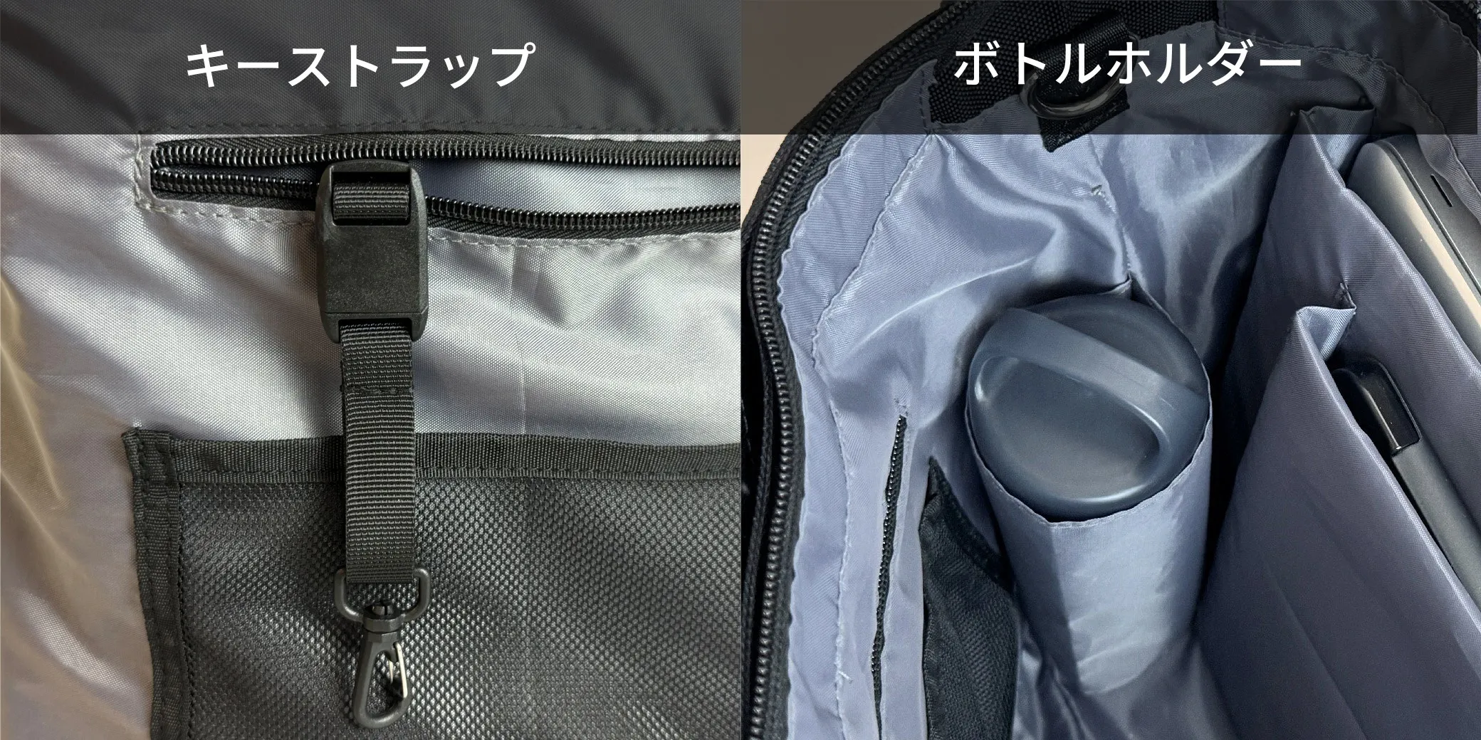 PCポケットの対面側には、マグネット着脱式のキーストラップを内蔵した大きなファスナーポケットと、メッシュポケット×2、ペン差し×2を装備し、側面には、ボトルホルダーを付けました。