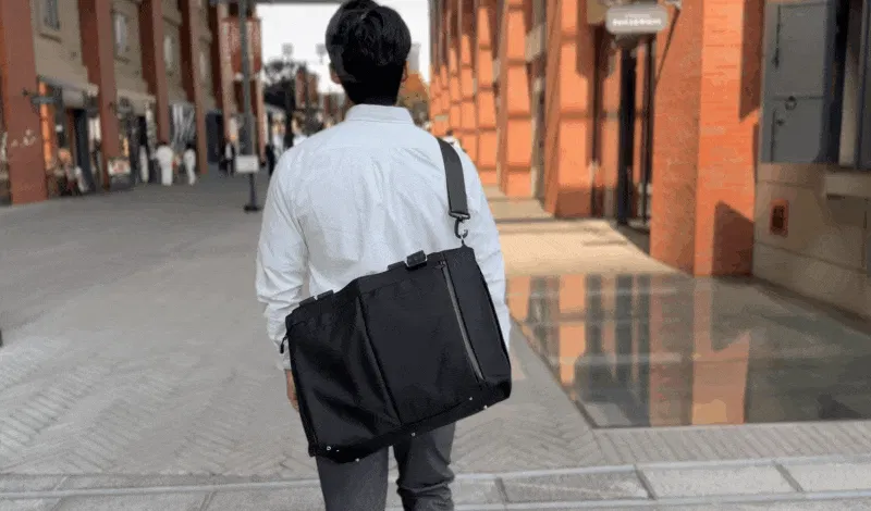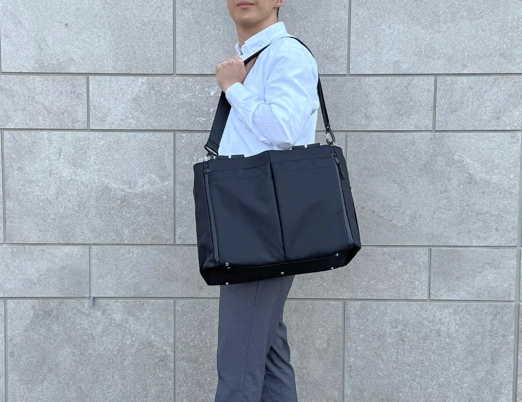 piunoが提案するこのテックトートバッグ「TANT16」は、たっぷり入るのに持ちやすい、肩掛けと手持ちをスムーズに持ち替え出来るように「ダブルハンドル」を採用しました。さらに付属のショルダーベルトを使用してメッセンジャーバッグにもなる3WAYでお楽しみいただけるバッグです。