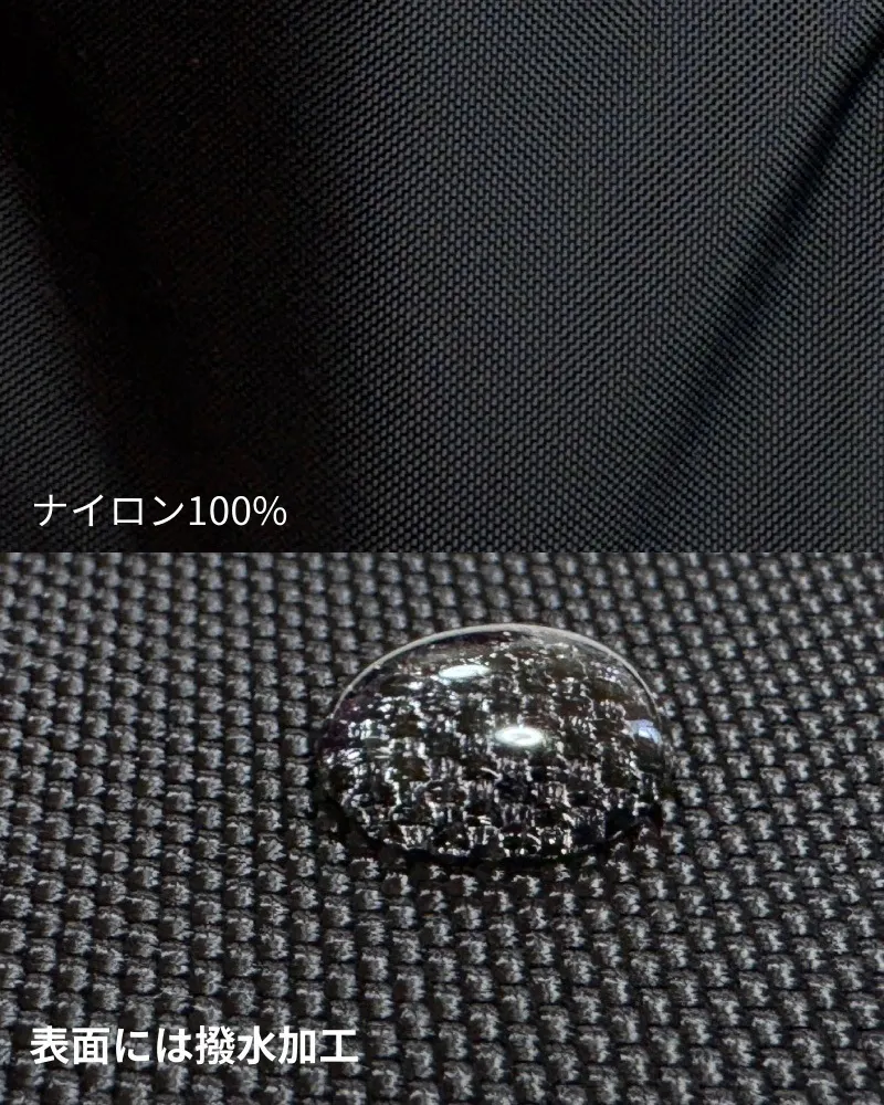 ナイロンはもともと水に強い素材ですが、撥水加工を施すことでさらに水や汚れに強くなります。急な雨や水濡れから中身を守れるのは嬉しいポイントです。(水滴をそのままにしておくと生地に滲み込んでしまうことがありますので、濡れた際は軽く拭き取ってください。)