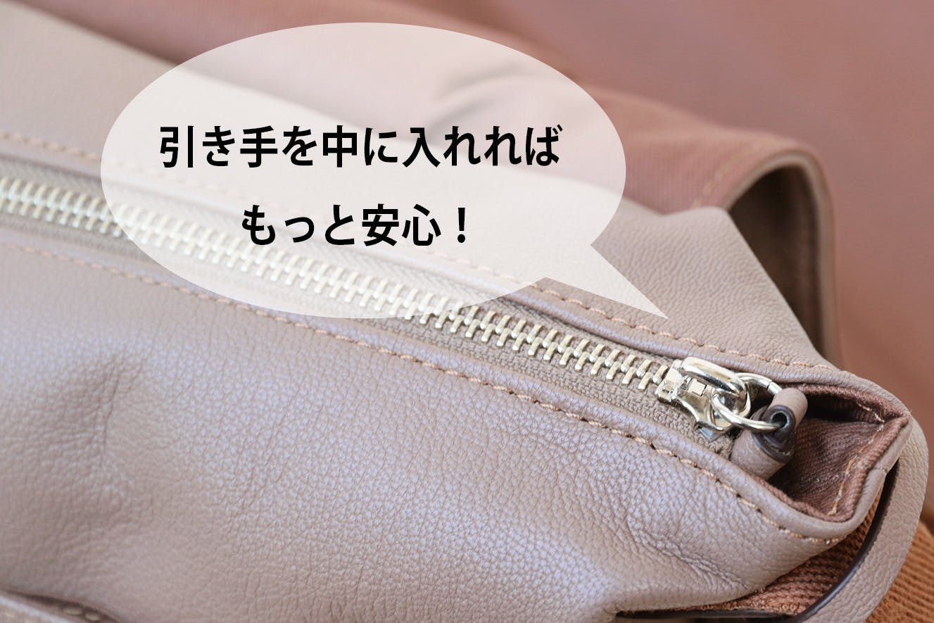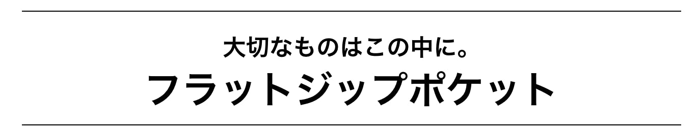 また、このフラットジップポケットはジッパー付きで、かつ【ジッパーの持ち手が内側を向いている】ので防犯面も安心してお使いいただけます。