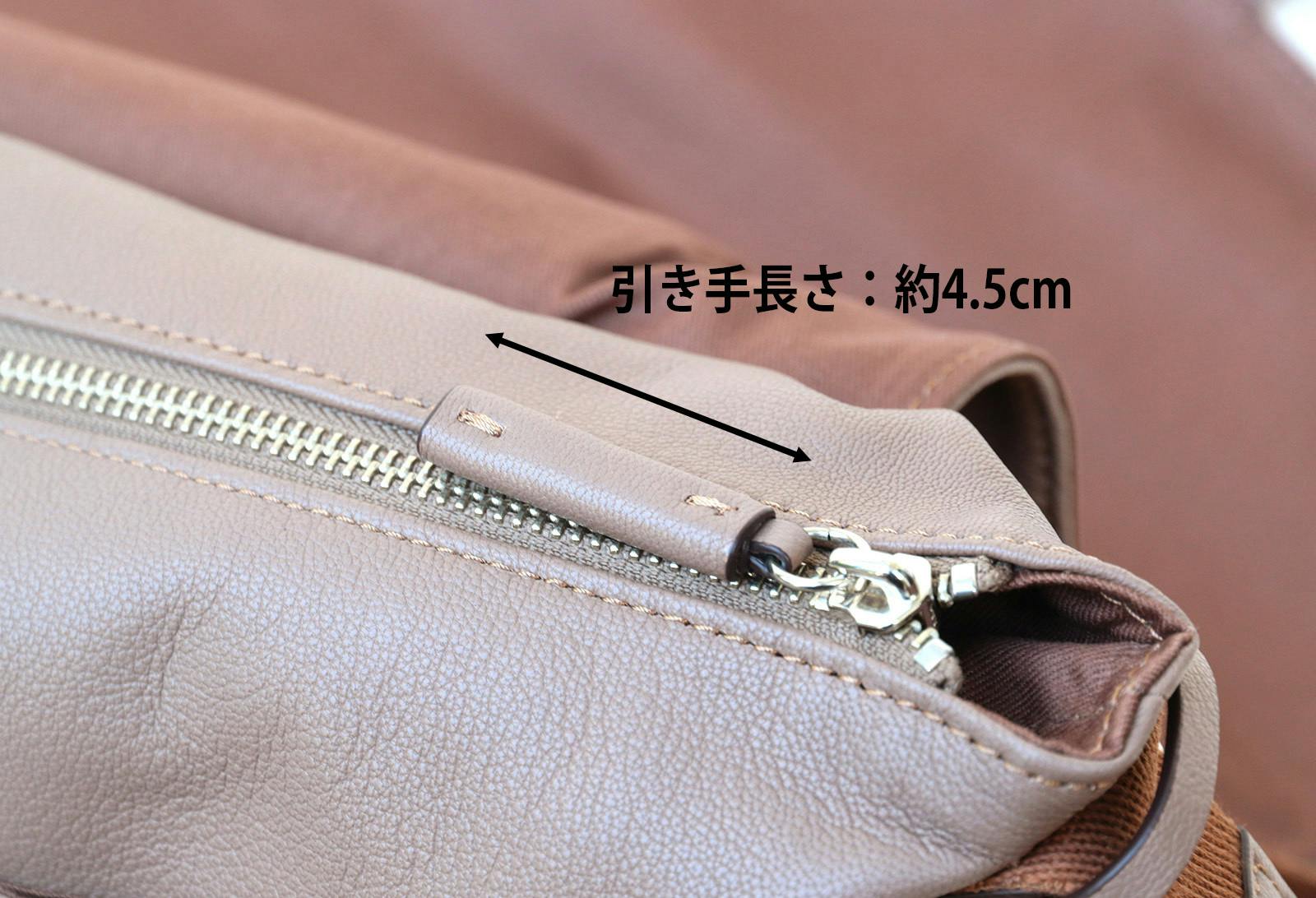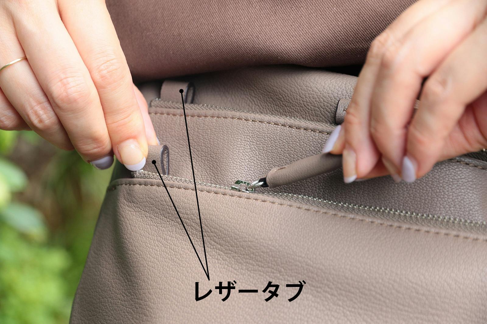 レザータブはジッパーの両側についており、タブを持って押さえることで、開ける時も閉める時も力を入れやすく開閉が楽にできます。