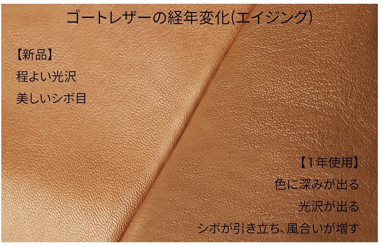 ゴートレザーの表面には美しい天然のシボ(ナチュラルシュリンク)があり、なんとも言えない艶があります。これは、型押しのシュリンクでは決して出せない、自然のものだからこその美しさです。