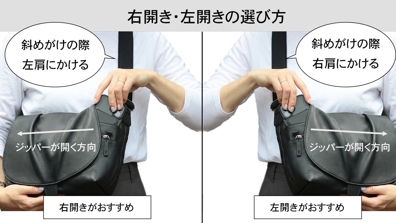 上の画像のように、斜めがけにした場合に、どちらの肩にかけるか?でお選びいただくのが一番おすすめの方法です。
