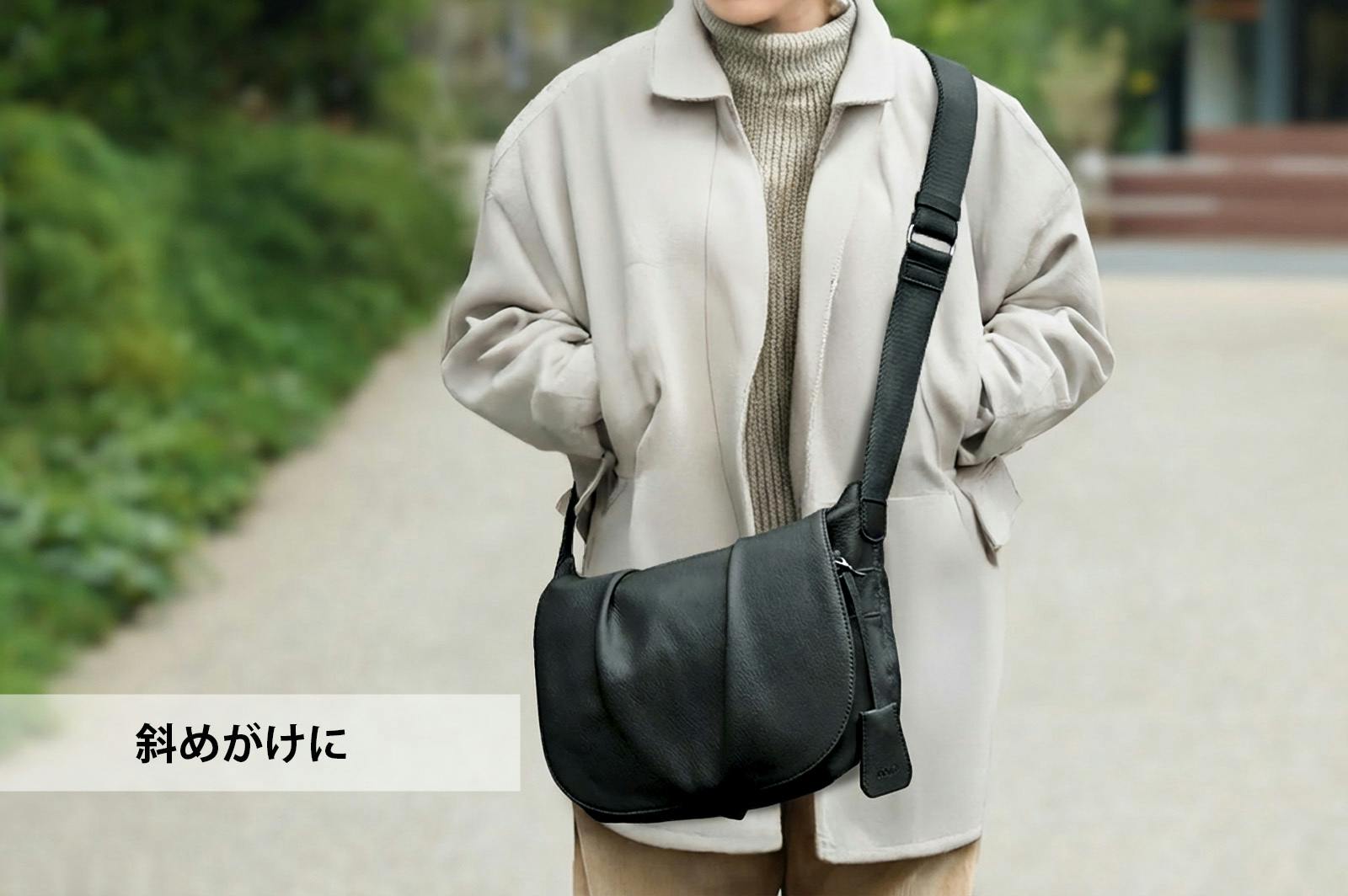 斜めがけはコートの上からでもゆったり掛けられる長さまで調節可能です。