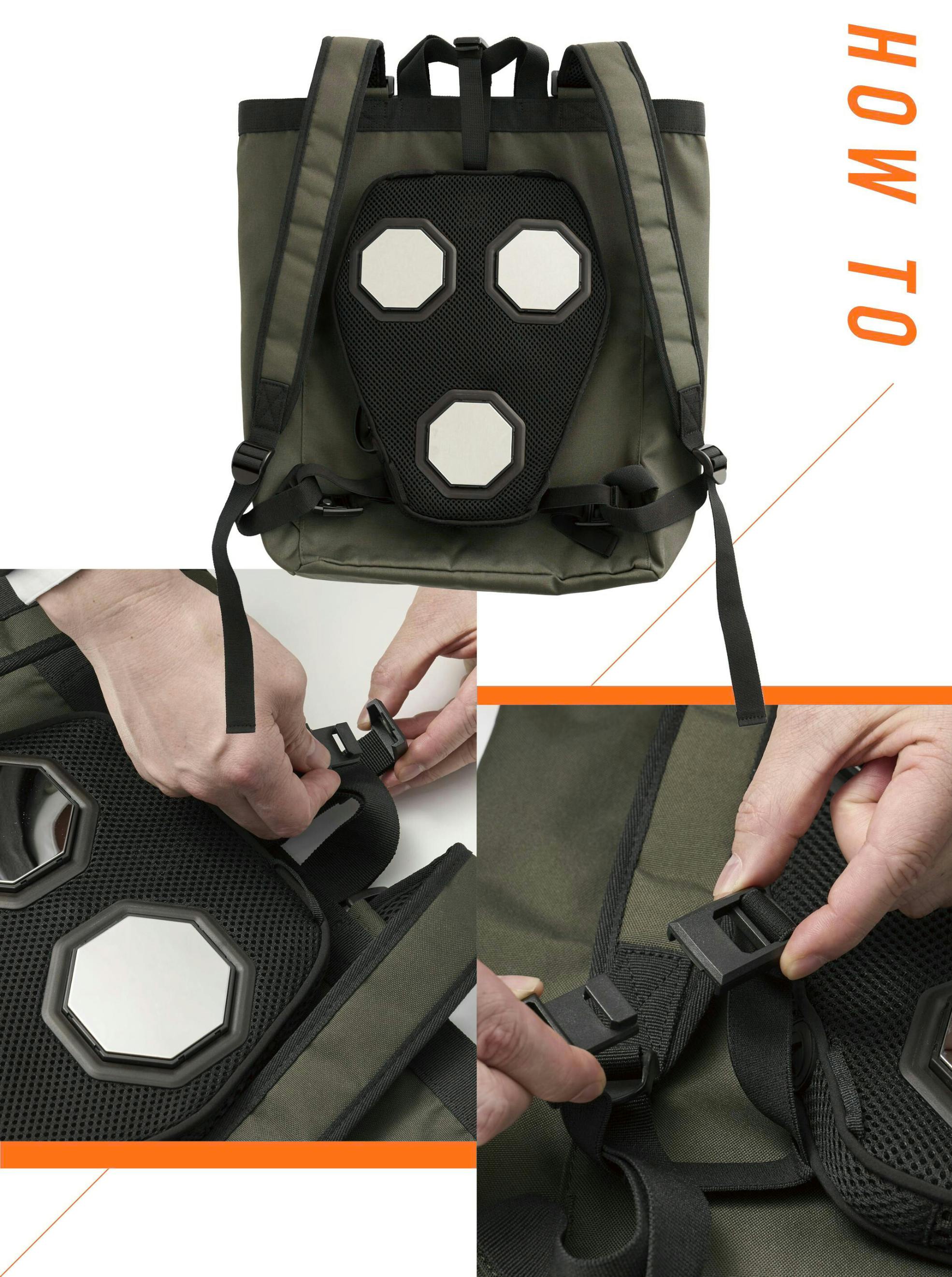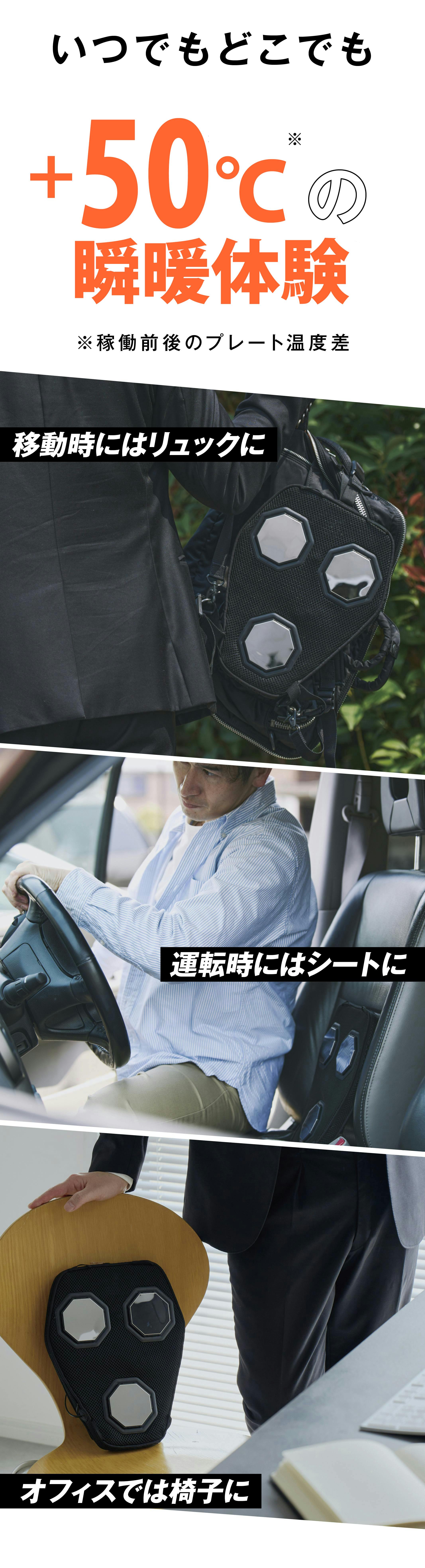 バッグにもシートにも装着でき、使い方はあなた次第!スイッチひとつで体に直接あたたかさを届ける、全く新しい防寒デバイスです。