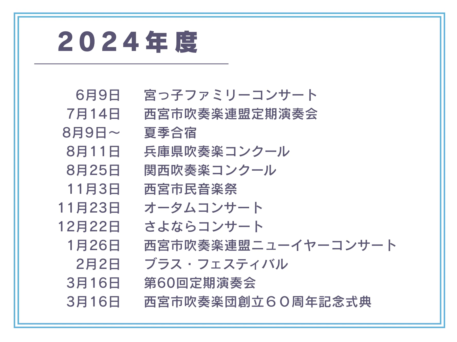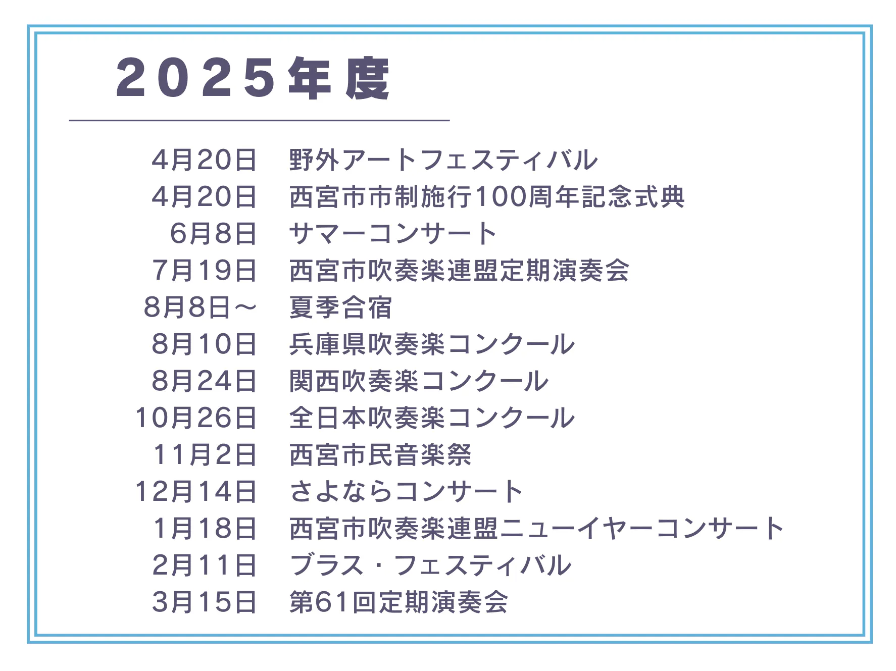 毎年の吹奏楽コンクールや定期演奏会に加え、西宮市民音楽祭や宮っ子ファミリーコンサートなど、地域のイベントにも積極的に参加し、市民の皆さまに親しまれる“身近な市民バンド”として活動しています。