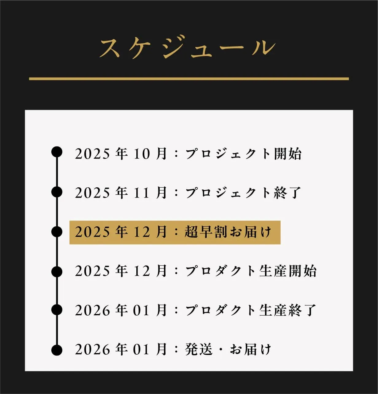●引渡し時期: 各リターン詳細に記載の発送予定月を引き渡し時期とします。但し、開発・生産状況によって遅れが生じる場合がありますのでその際は当プロジェクトページ内の「活動報告」または購入者へのメール等で連絡します。