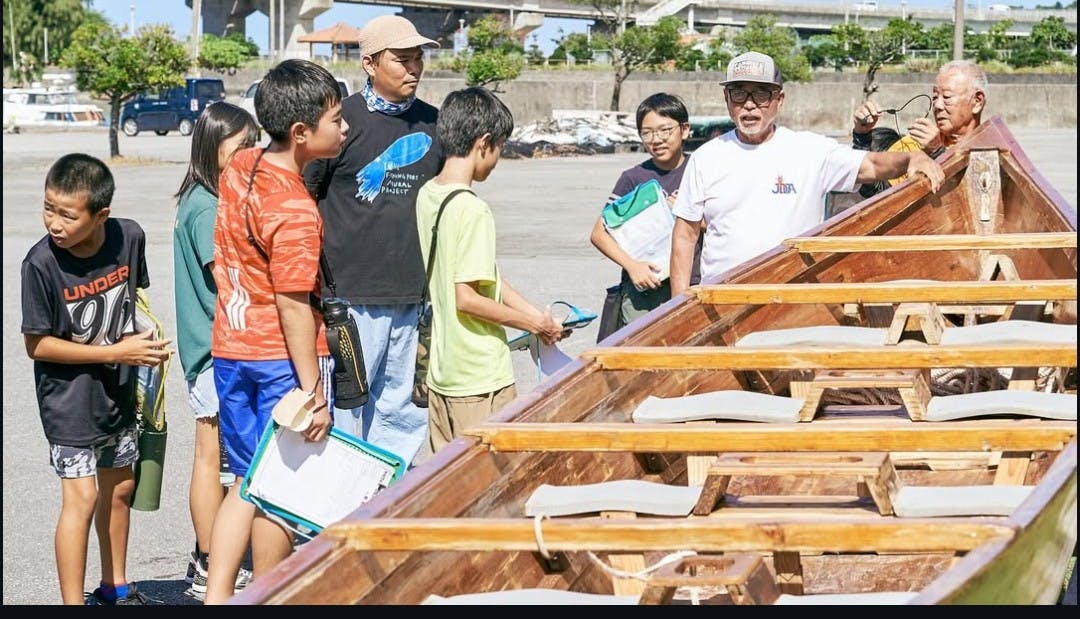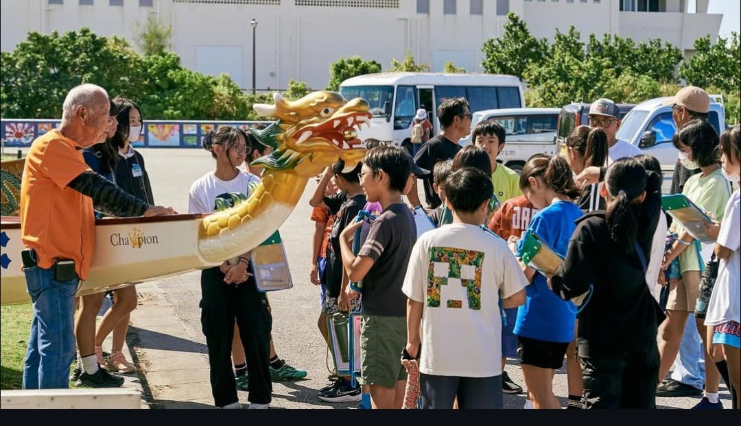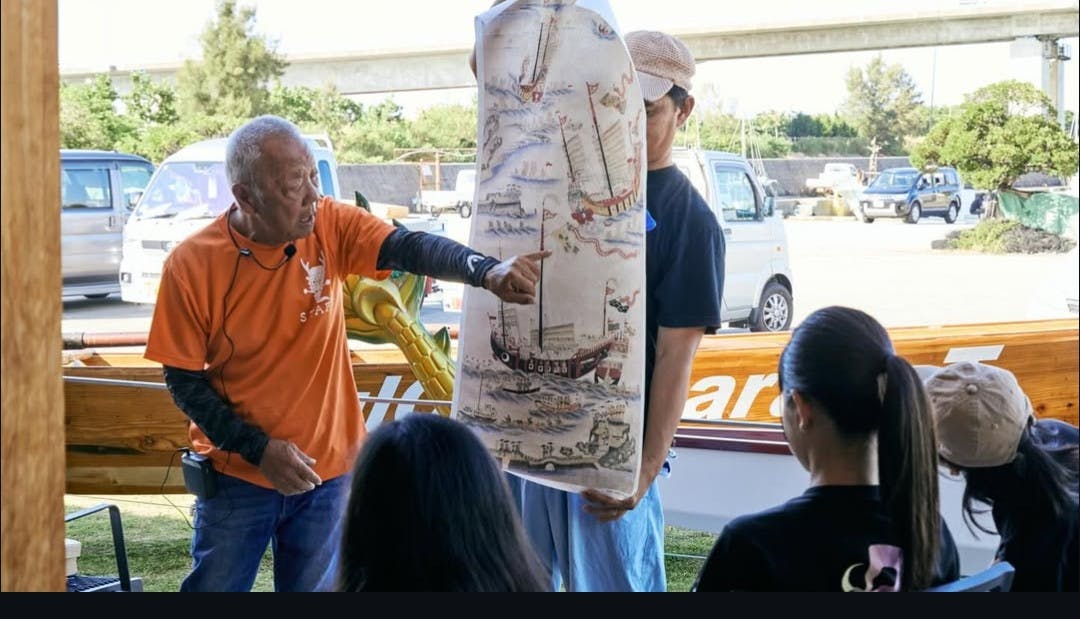 2025年9月29日(月)壁画テーマである「爬龍船」について、爬龍船発祥の地豊見城市。豊見城龍船協会の赤嶺さんから爬龍船の「歴史」や「デザイン」についてお話をして頂き、宝ハーリークラブの久場さんからは「爬龍船」と「サバニ」の違いなど、実物を観て触れながら、