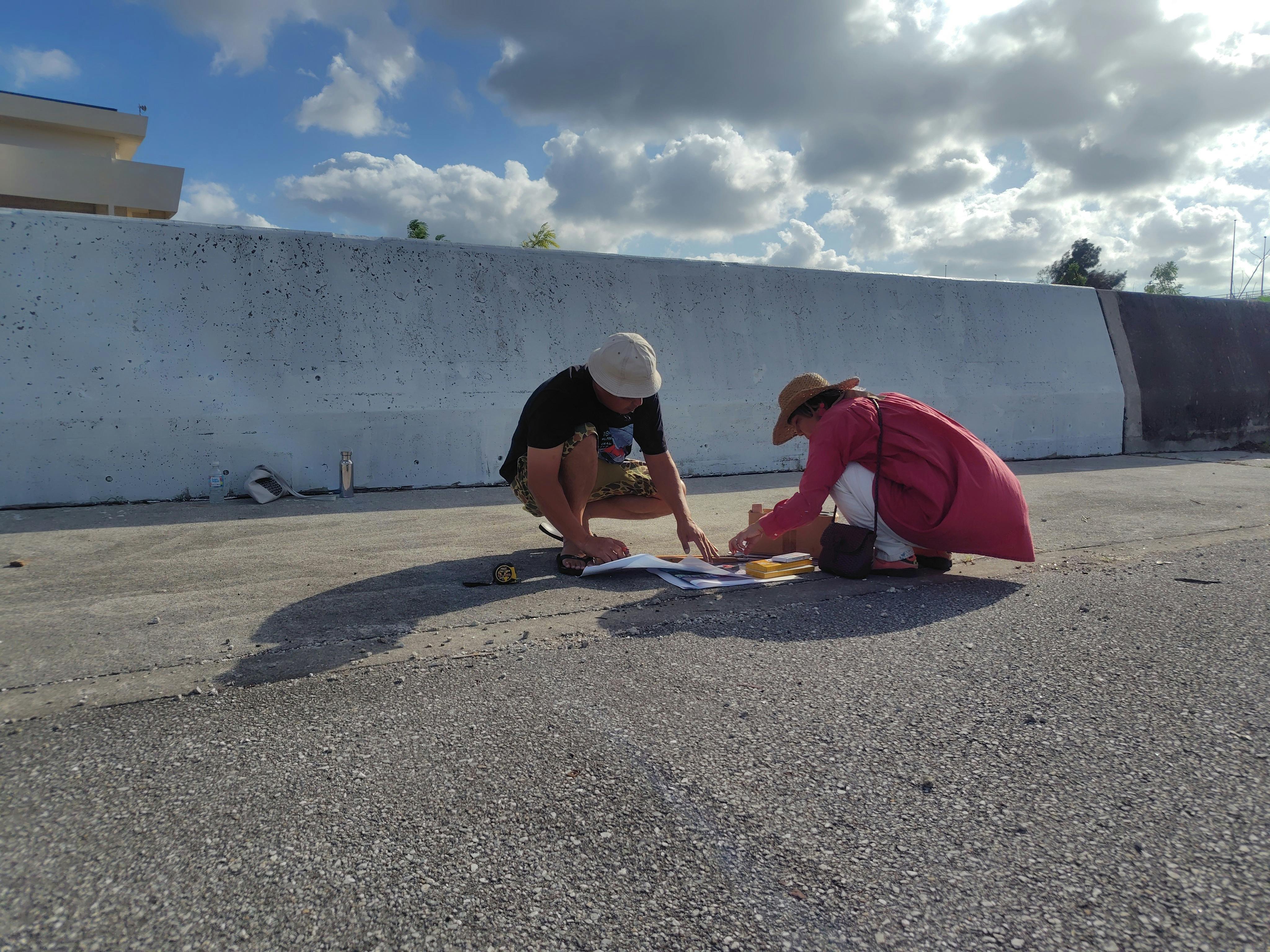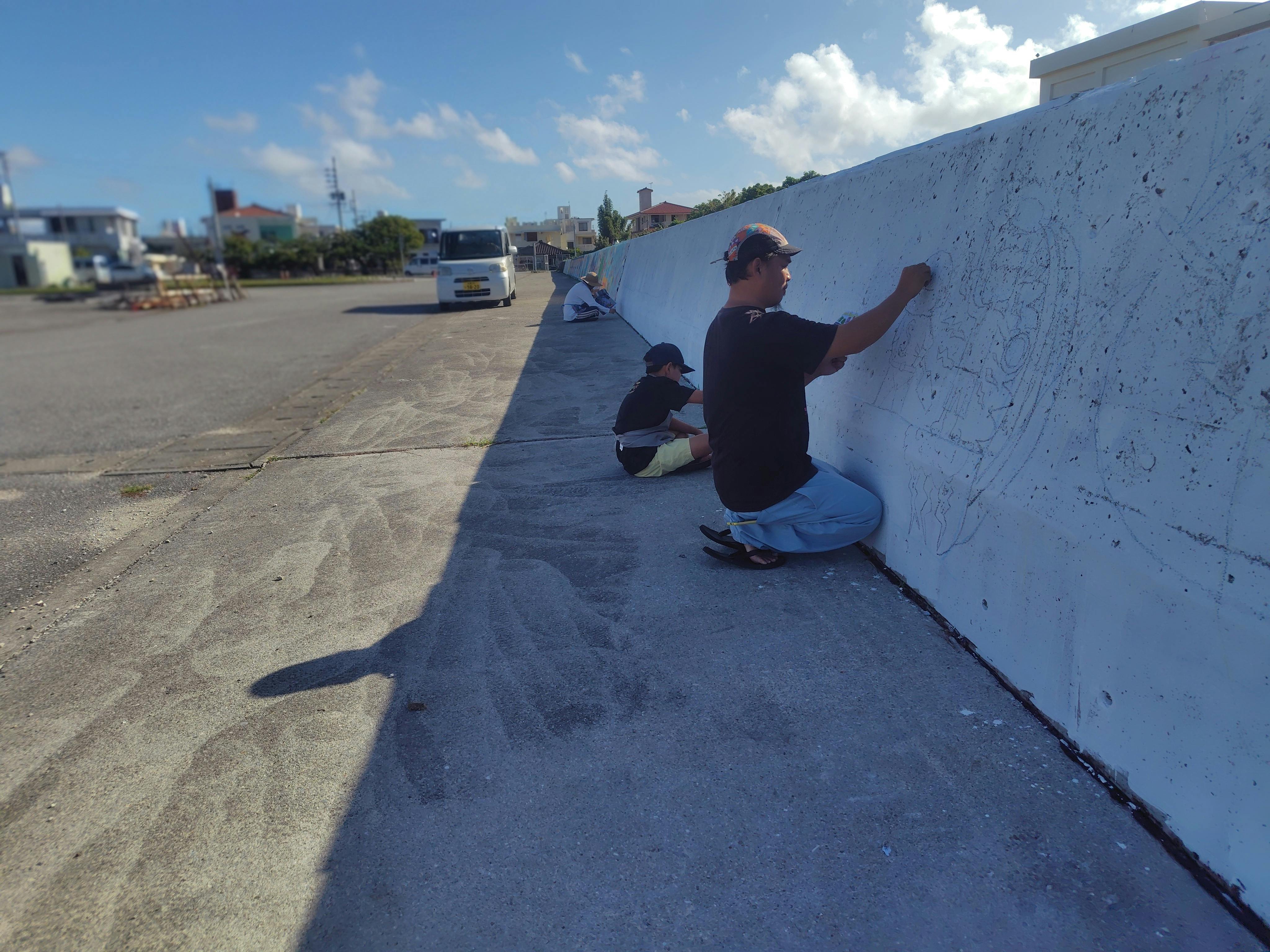 2025年11月8日(土)、9日(日)に堤防の区画分けをし、子どもたちが描いてくれた原画を忠実に壁画にしていくための準備を行いました!