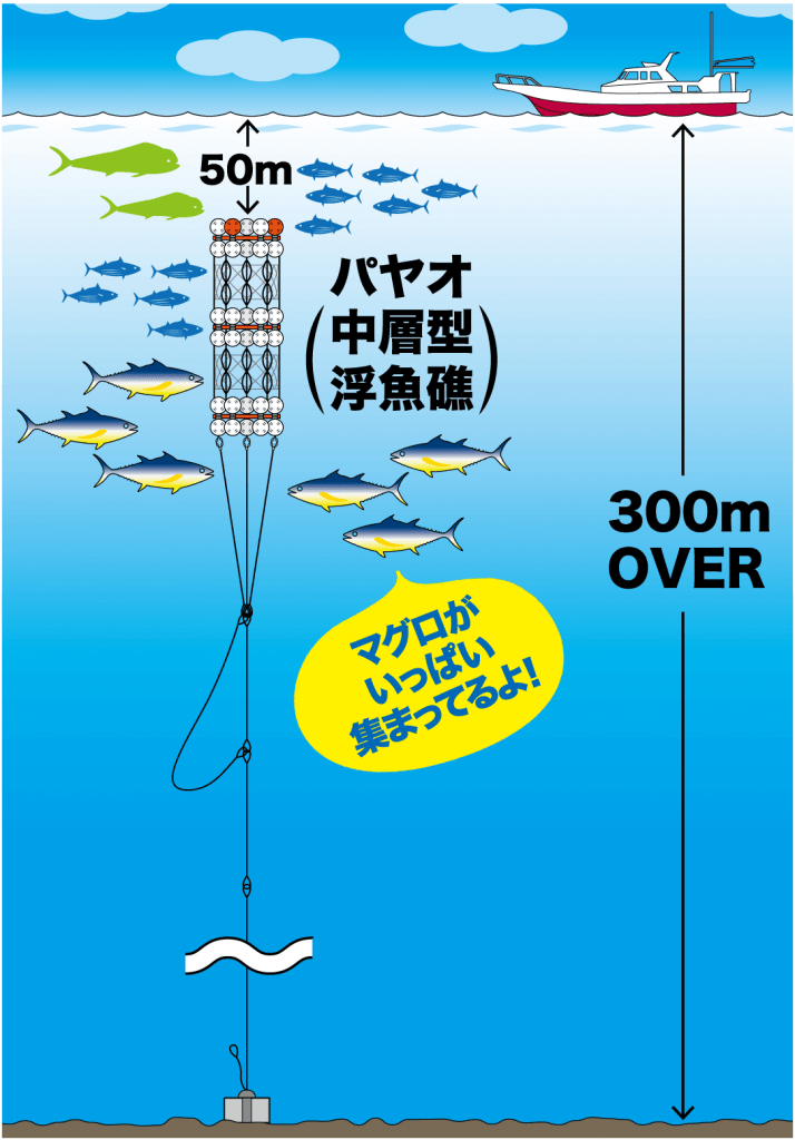 自然の流木に魚が集まる習性を利用し、海面に浮くブイの部分と海底のアンカーをロープでつなぐ構造(水深2000m)で、回遊魚などを集める目的で使われ、