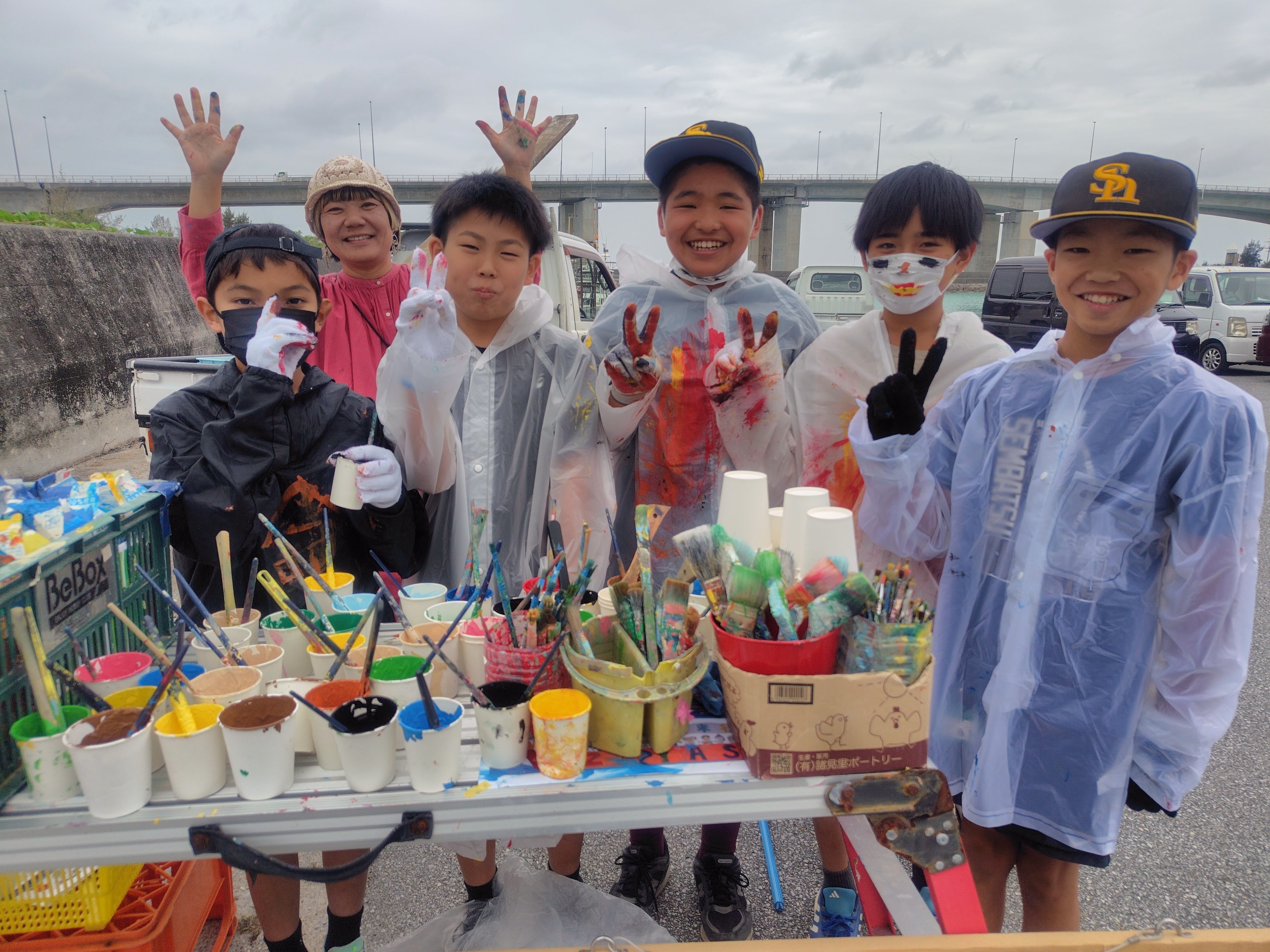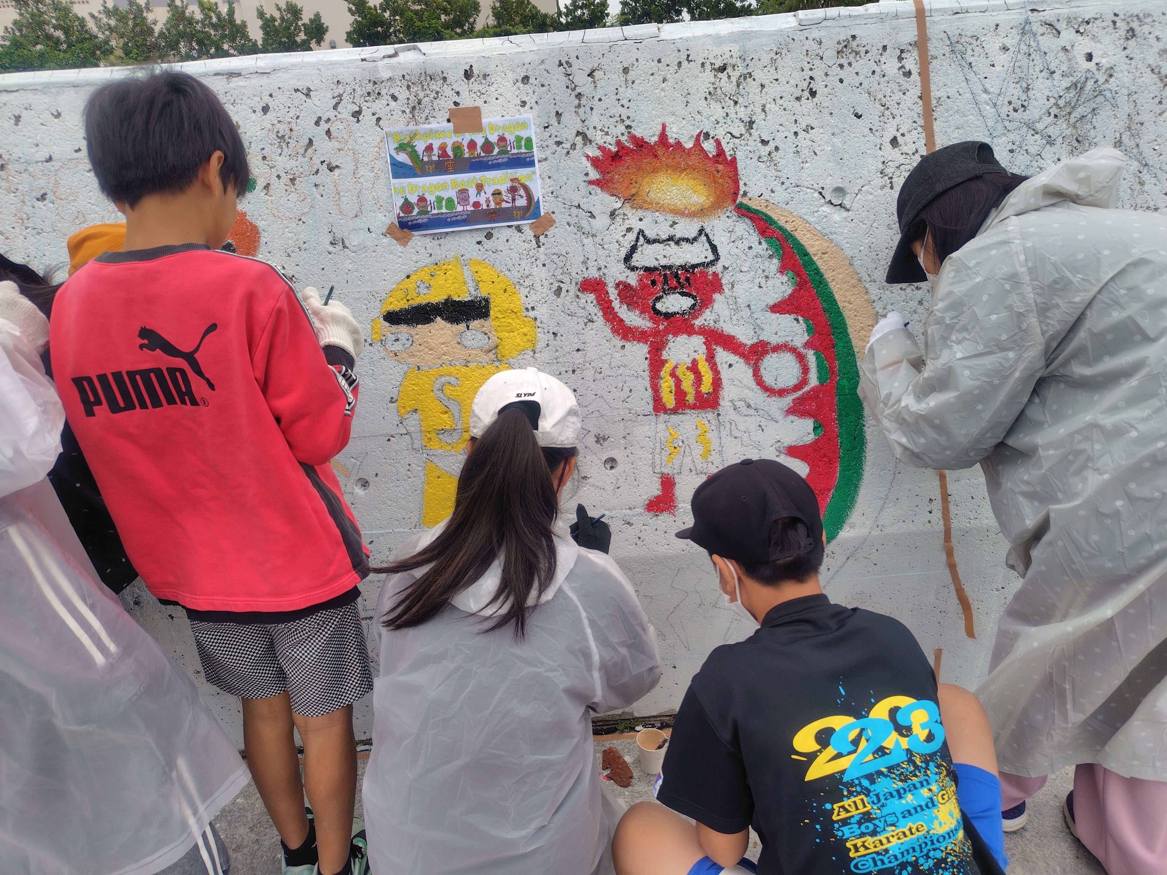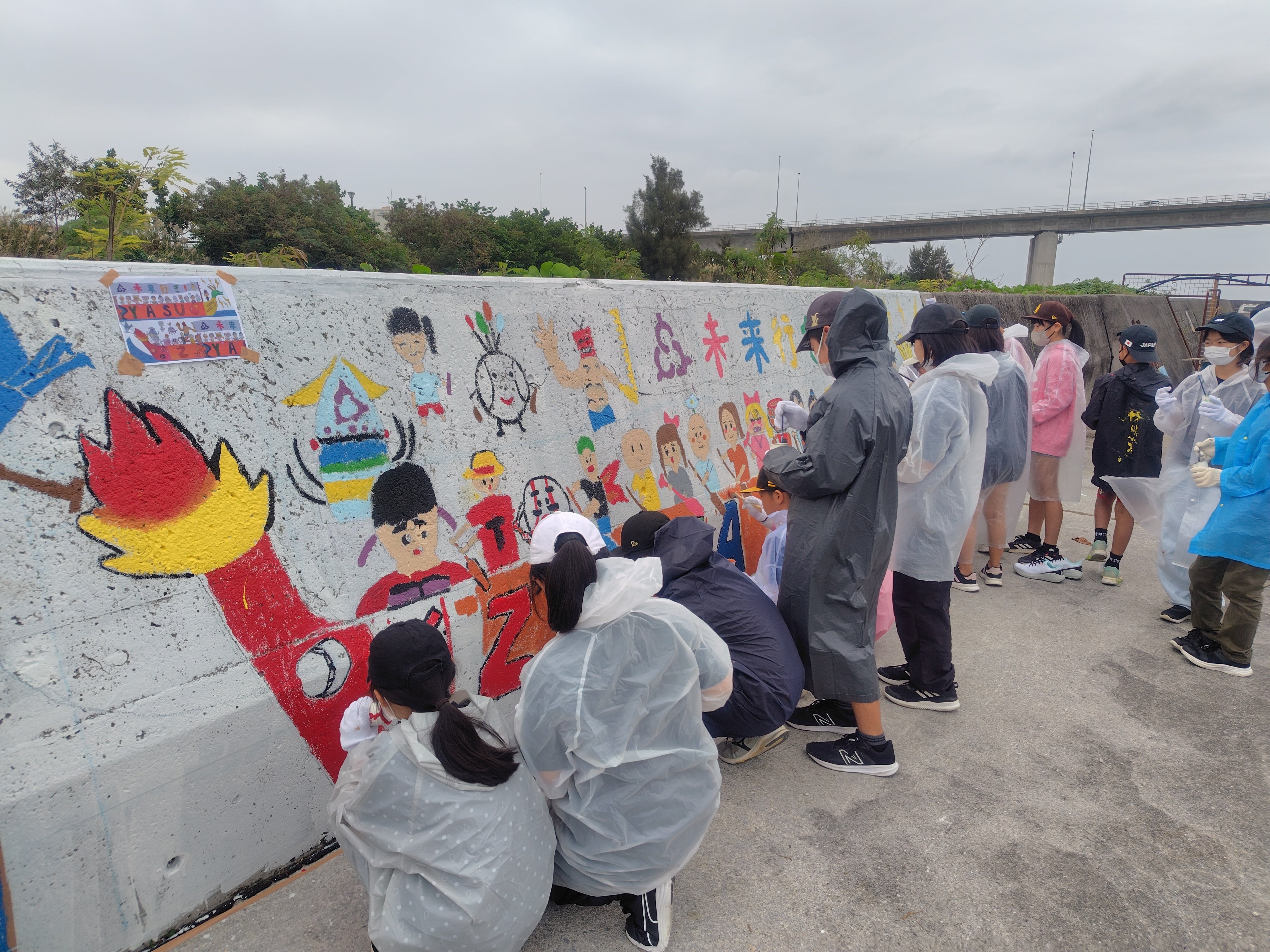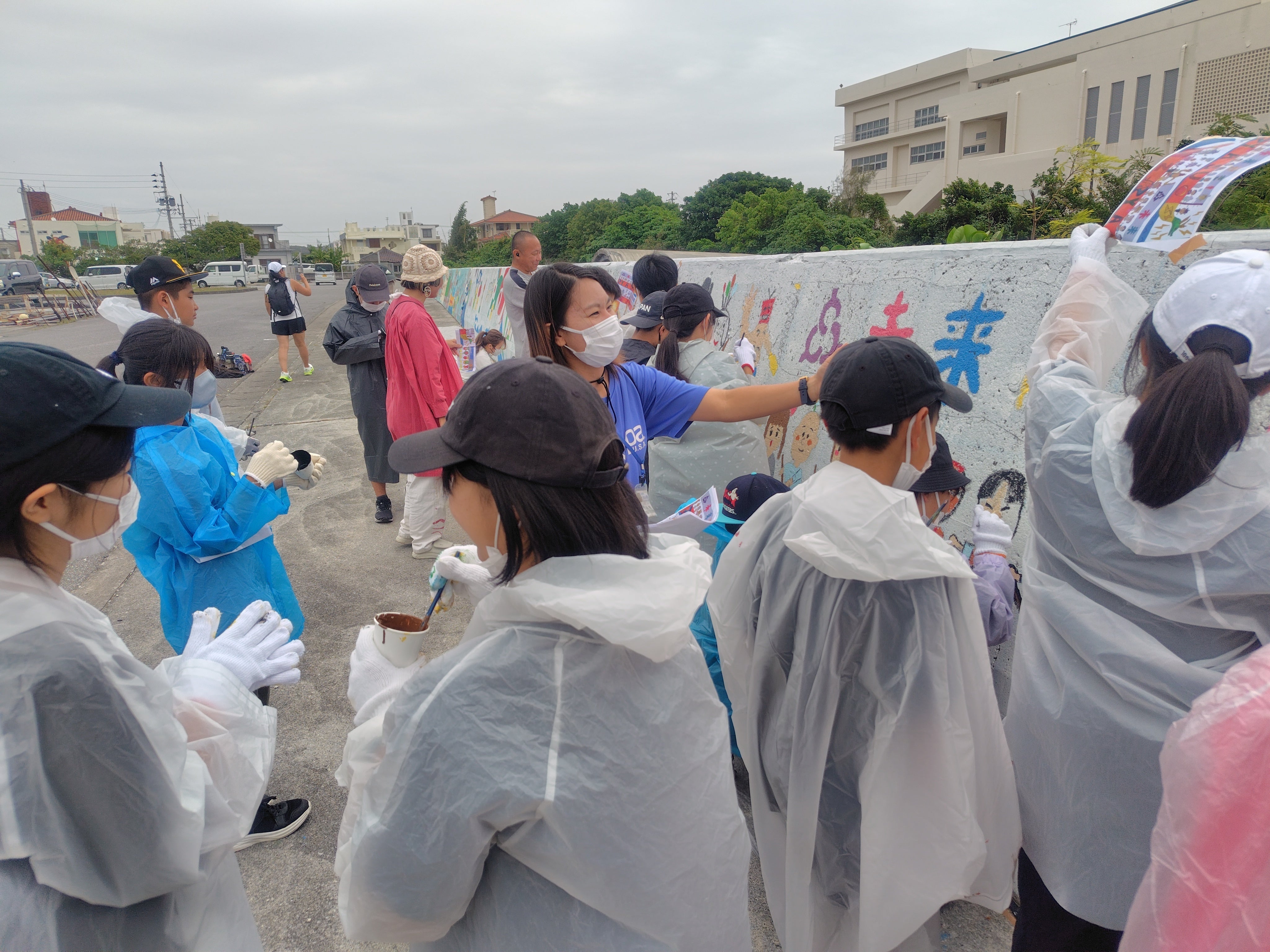 多数の保護者さん、校長先生や教頭先生、豊見城市長や豊見城市教育長も一緒になって4年目の壁画も無事に行うことができました!