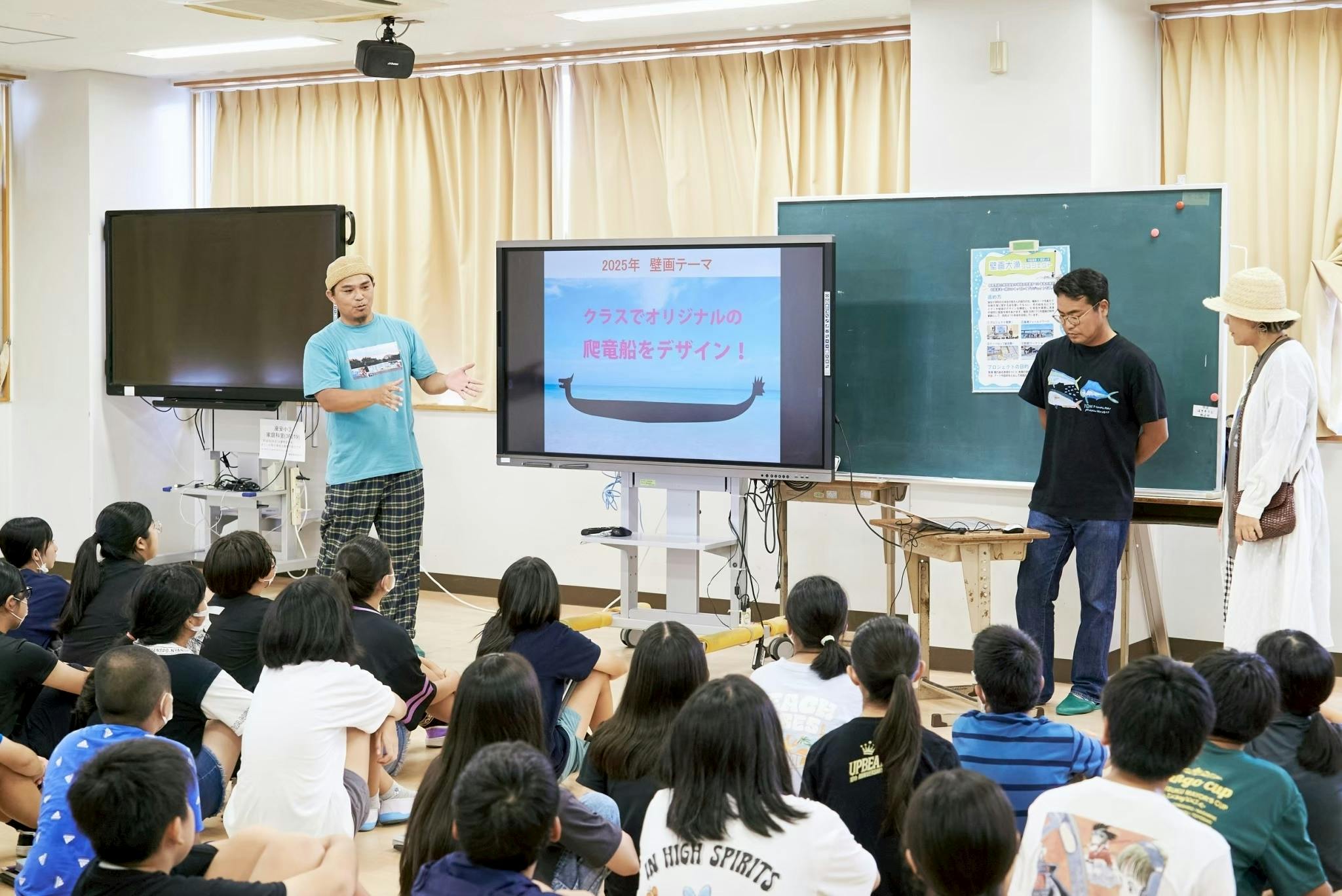 2025年9月29日(月)壁画テーマである「爬龍船」について、爬龍船発祥の地豊見城市。豊見城龍船協会の赤嶺さんから爬龍船の「歴史」や「デザイン」についてお話をして頂き、宝ハーリークラブの久場さんからは「爬龍船」と「サバニ」の違いなど、実物を観て触れながら、質問タイムでは「なぜ龍は金の玉を加えているのか⁈」や爬龍船に使用されている「色の意味」「デザイン」に対する質問が多く、子どもたちはさらにイメージを膨らませることができたのではないかと思います。爬龍船の歴史文化を学ぶ良い機会になり、どのような爬龍船を子どもたちが描いてくれるのか楽しみです!