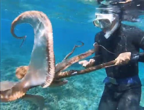 (写真上は小型定置網からの甲イカ(方言:クブシミ)を持っている父と私、写真下は素潜り漁でタコを捕っている私になります)