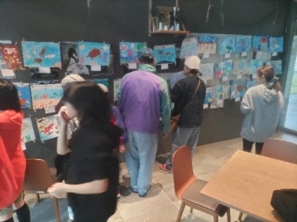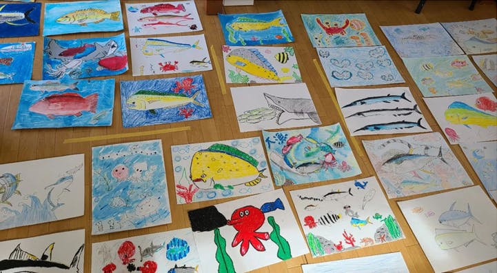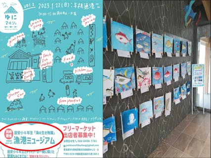 子どもたちの感性を地域で分かち合う場として壁画制作終了後に1ヶ月間「漁港ミュージアム」を開催しています。この原画展は壁画に採用されなかった子どもたちの原画も含めた全原画の展示会になり、皆で壁画制作しているという一体感を感じてもらいたいという願いのほかに、