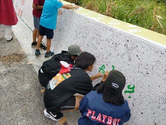 2025/11/29 20:192025年11月28日(金)多数の保護者さん、校長先生や教頭先生、豊見城市長や豊見城市教育長も一緒になって4年目の壁画も無事に行うことができました!子どもたちが描いた1つひとつの原画が、一枚の壁画になっていきます!ペンキの汚れを気にすることもなく、色合いを確認しながら、慎重にかつ大胆にペイントしてくれました!子どもとたちの「笑顔」「声」にと活気溢れた空間となりました!今日で壁画は完成していないので、これから1カ月ほどかけ、子どもたちと週末に壁画を仕上げていきます。引き続き活動報告をあげさせて頂きますので、壁画の完成までどうぞお付き合い下さい! もっと見る