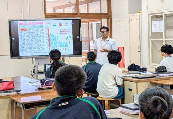 プロジェクトではまず毎年9月に座安小学校へ出向き、6年生を対象に「豊見城市/与根の海に関するテーマ発表」を行っています。テーマは毎年変更し、地域学習へと結びつけています。