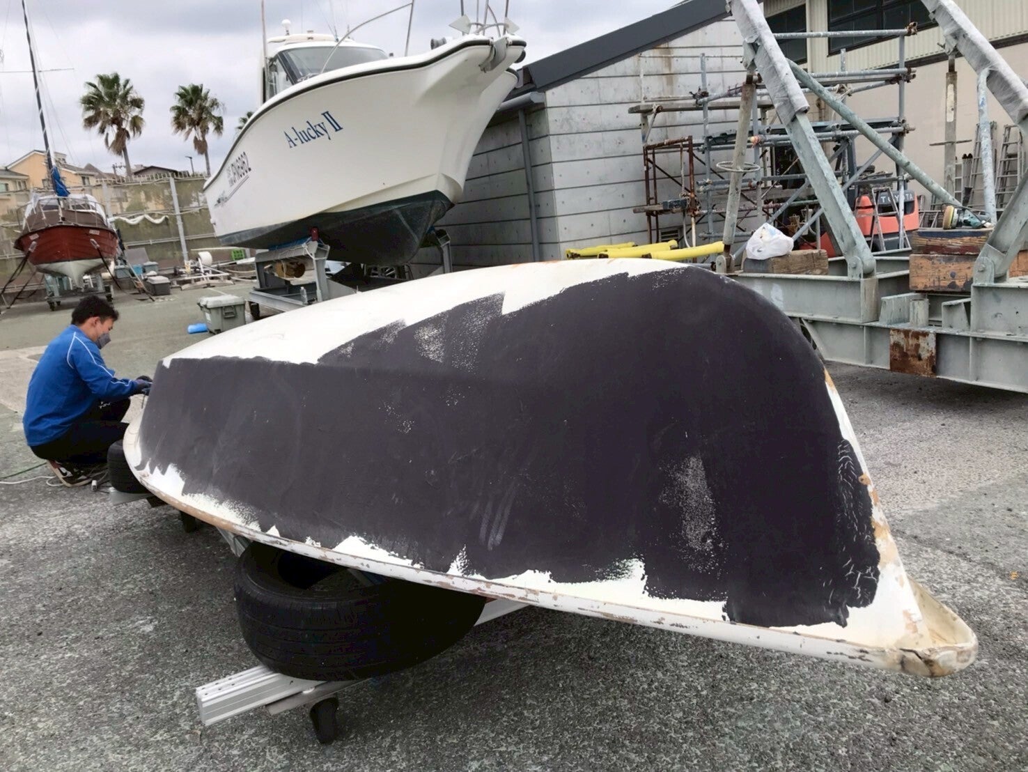 船底のゲルコート貼りが、終わったので、艇を裏返して上面デッキの整備に入りました。黒いペンキや、痛んだゲルコート層を剥いだあとは、こんな状況です。グラインダーも使ったので、ところどころ深い傷もあります。バウデッキには大きなへこみもある状態です。下の写真はゲルコートを塗布している過程の写真です。意外とてこずったのがバウデッキのへこみでした。もともとあった凹みの様ですが、この機会に平滑化する事にしました。形状が出来上がったら、ゲルコートの凸凹を紙やすりで平らにしていきます。練習の後、みんなでワイワイやすり掛けをしました。ここでも数は力。1人で10時間かかる作業も大人数でやると比較的短時間で終わります。写真でみる分には綺麗になりました。でも、近くで見ると、まだ表面は凸凹です。でも、上面デッキはひとまずここで区切りをつけて、船底の仕上げに移ります。