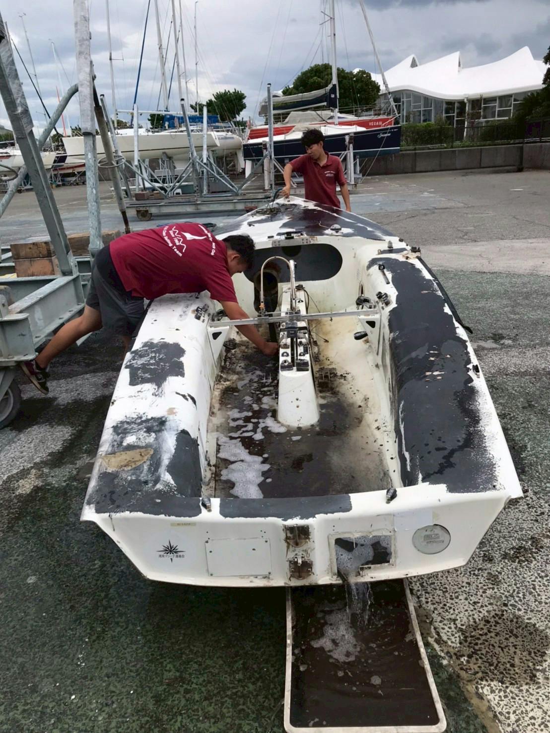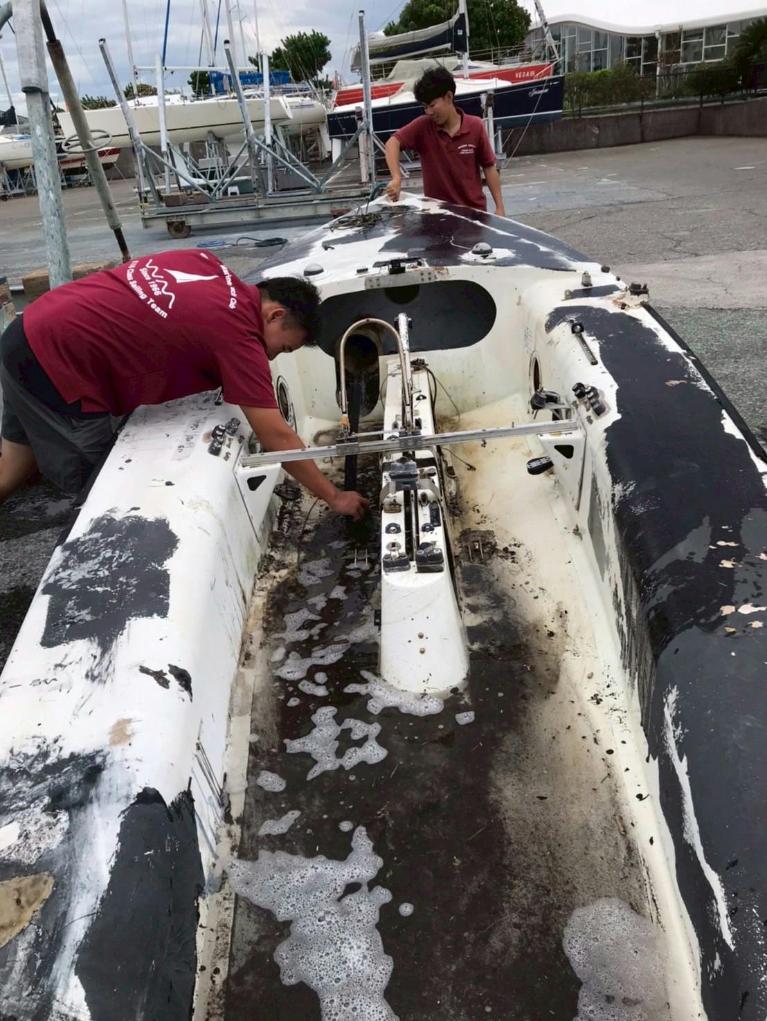 船内を水洗いすると、あちこちから泥が出てきます。それから、なぜか大量の泡。。。