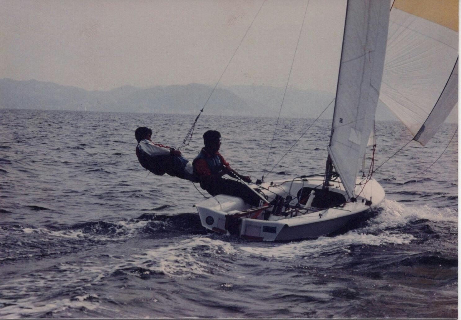 一緒に写っている1087号艇は、青山学院大学理工ヨットセーリングクラブが今も乗っています。