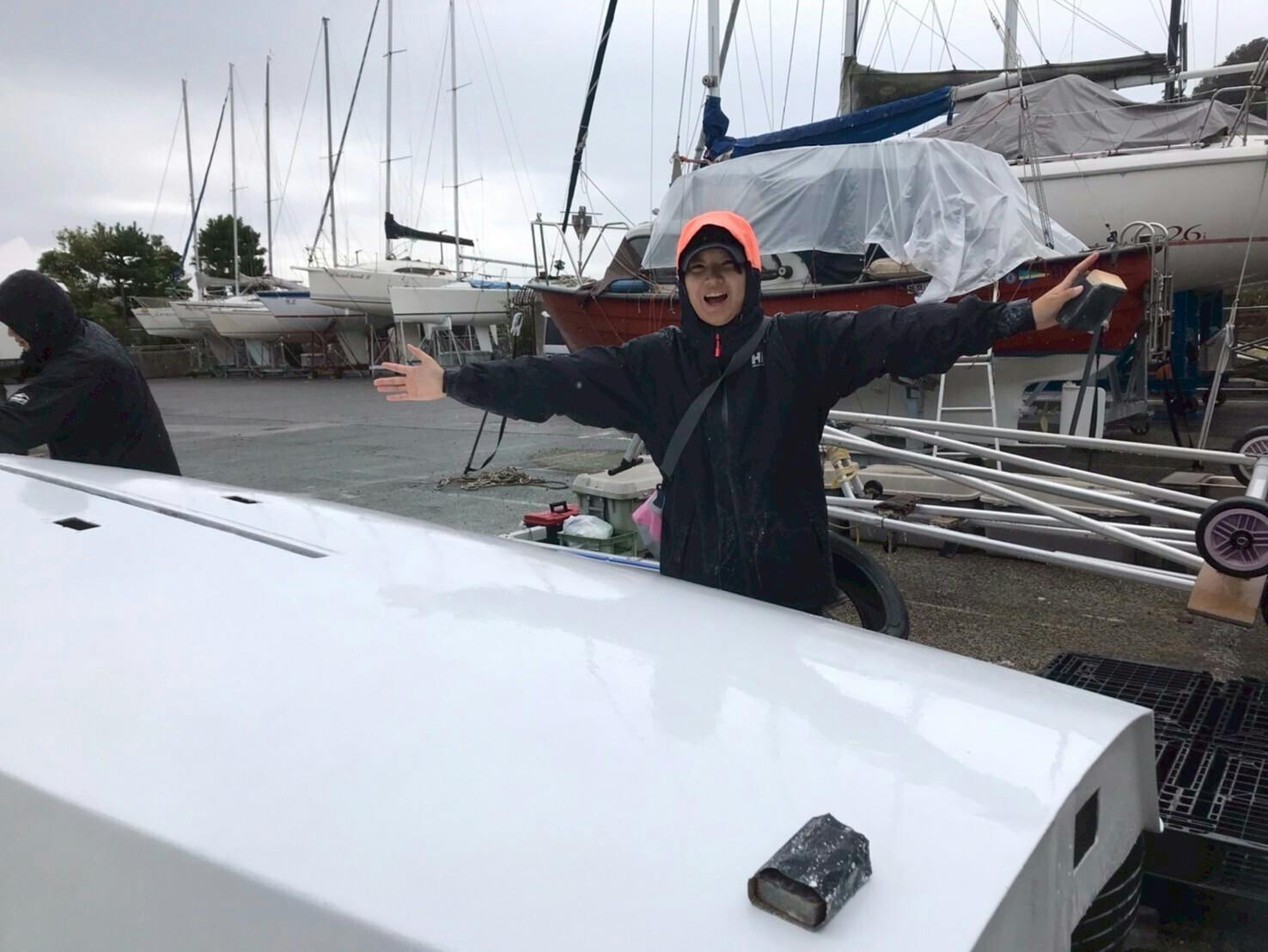 船底にFRP樹脂(ゲルコート)を塗りましたが、ゲルコートは粘性が高いので、塗っただけでは平坦になりません。そこで、まずは粗目の耐水紙やすりで船底の磨きを実施しました。