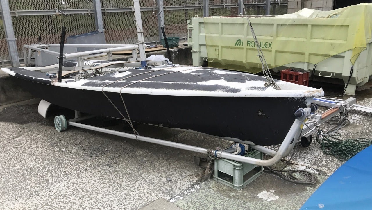 作業前の1110号艇。発見当時は、ごみ溜めの中、どこに船があるのかもわからない状況でしたが、少し整理されて船が見れるようになった当時の写真です。このエリア自体がごみ置き場です。この写真の当時も、船の中に沢山のごみがある状態でした。表面には黒いペンキが乱暴に塗られています。噂では、どうせ捨てる船だからと心無い人がいたずらでペンキを塗ったとの事です。厚く塗られたペンキを剥がすのは大変ですが、頑張ってやるしかありません。放置艇となっていたので、私たちの所有権を役所などに認めてもらう必要があり、この当時は、私たちが手を出せない状況でした。関係各所との調整に半年以上を費やしました。2025年の夏に、ようやく私たちの所有権が認められ、整備を開始する許可がおりたので、1110号艇の整備が動き出しました。