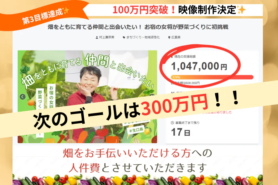 300万円達成したら→畑をお手伝いいただける方への人件費とさせていただきます。