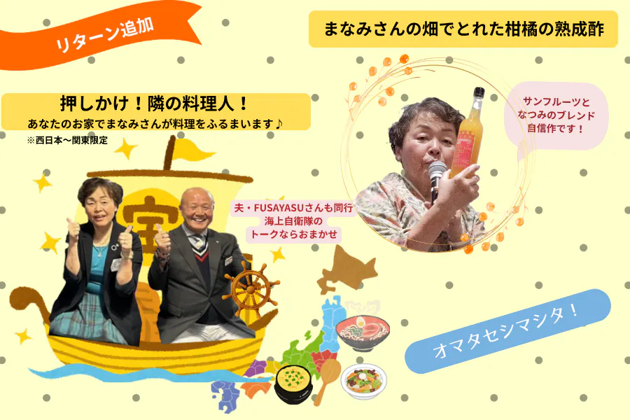 あなたのお家でまなみさんが料理をふるまいます♪】限定1口・20万円