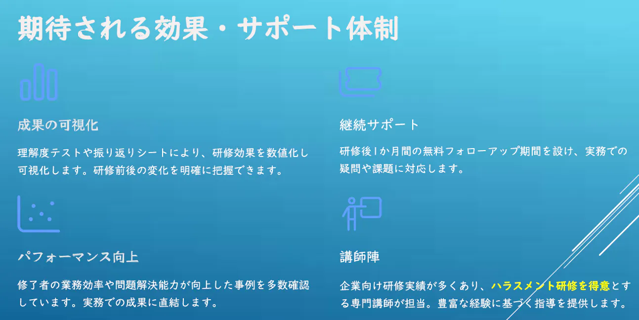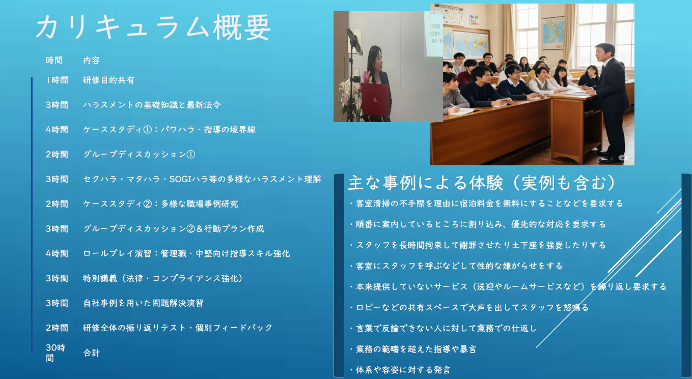 独自のサービス開発: 既存のハラスメント研修「難解シリーズ」をさらに発展させ、個人向けにカスタマイズしたプログラム(ビジネスマナー研修等)の開発を進めています。