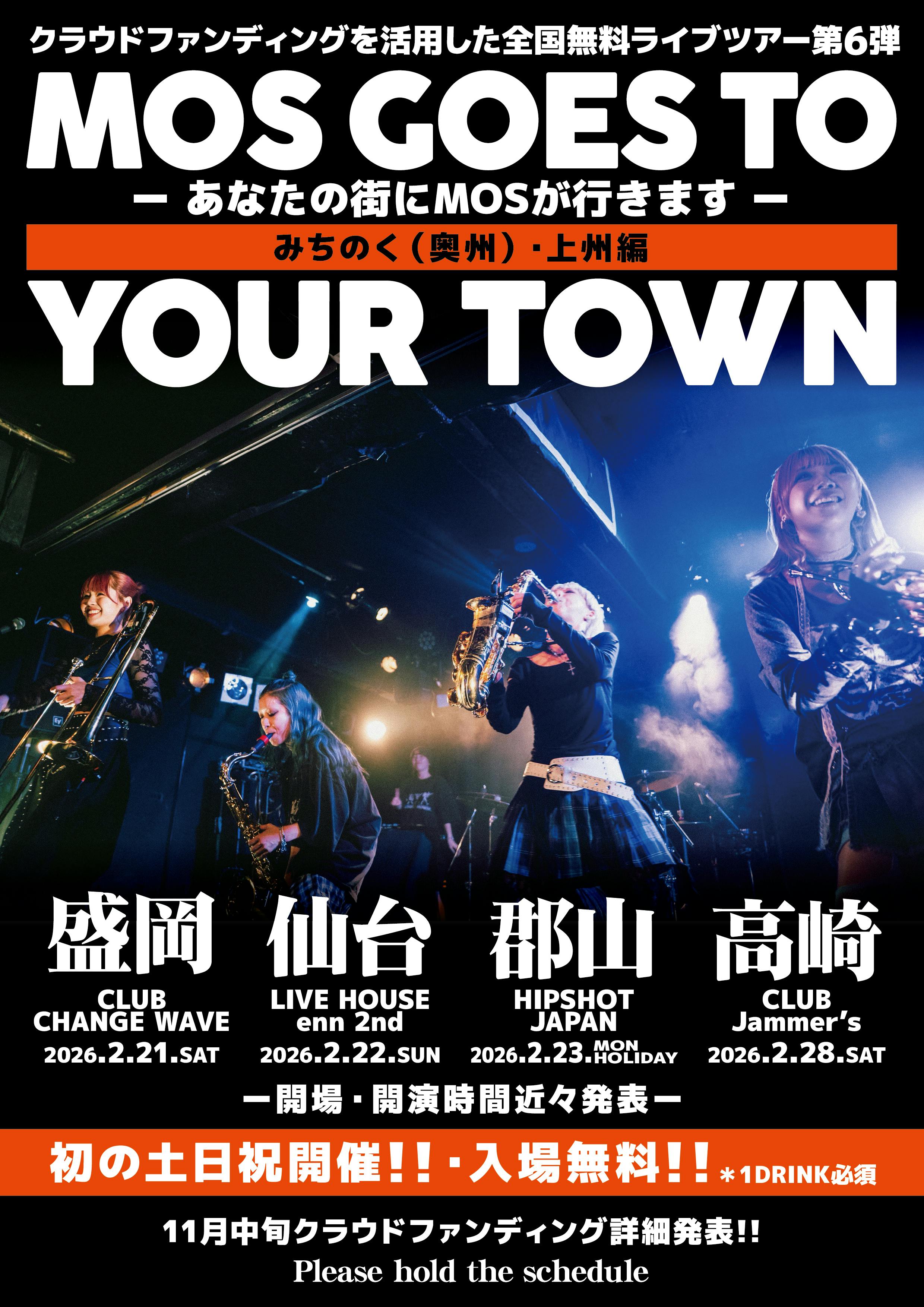 MOS恒例となったクラウドファンディングを利用した無料ライブツアー、【MOS GOES TO YOUR TOWN】〜あなたの街にMOSが行きます〜。