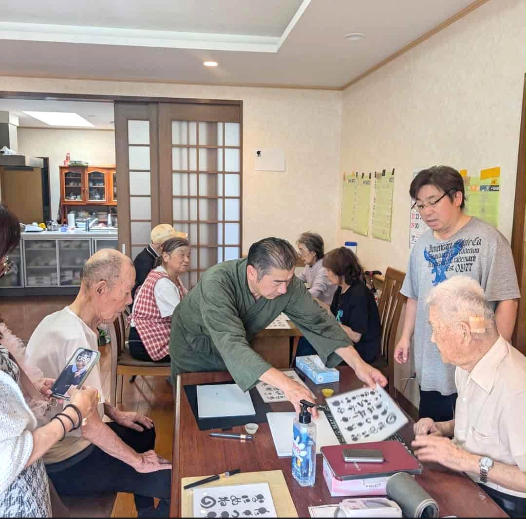 ▼書道教室の先生を招いて楽しく筆を走らせてます。