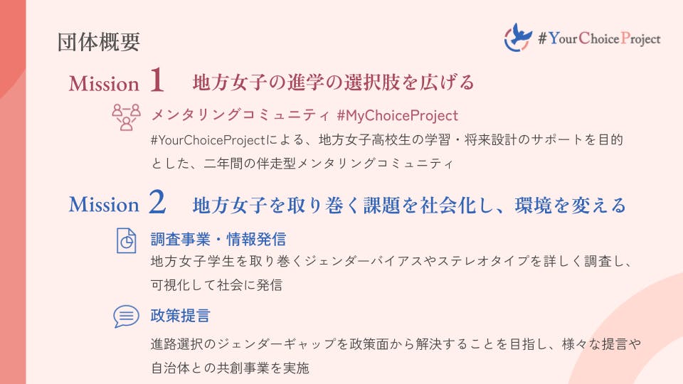 私たちは、そんな課題を解決したいと思い活動しているNPO法人#Yourchoiceprojectです。2021年より、以下の二つのミッションを掲げ活動しています。