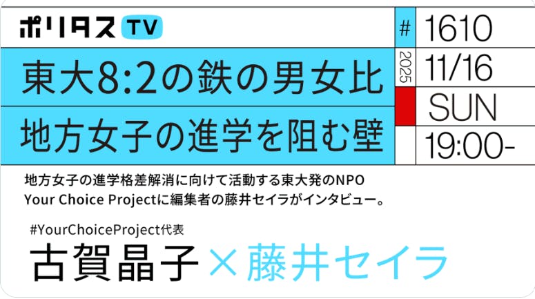 2025/11/17 18:26#YCPの代表・古賀がポリタスTVさんのYoutube配信に出演させていただきました!東京大学の先輩でもある藤井セイラさんと一時間近く対談させていただきました。団体のCo-Founderの著書『なぜ地方女子は東大を目指さないのか』や今回のクラファンのことも取り上げていただいています。ぜひご覧ください! もっと見る