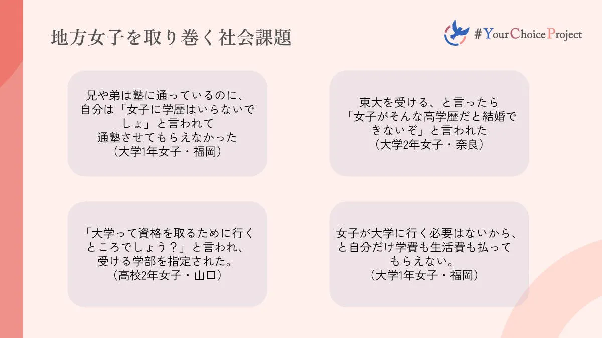 地方女子の進路が狭められているという課題がなかなか解決しない要因の一つに、当事者である彼女たちがこの問題を認識していない場合が多いことがあります。「女の子は親のところにとどまる」という考えを「普通のこと」ととらえ、兄や弟と進学において差が生まれていてもそれに対して疑問を抱かない地方女子が多いのが現状です。