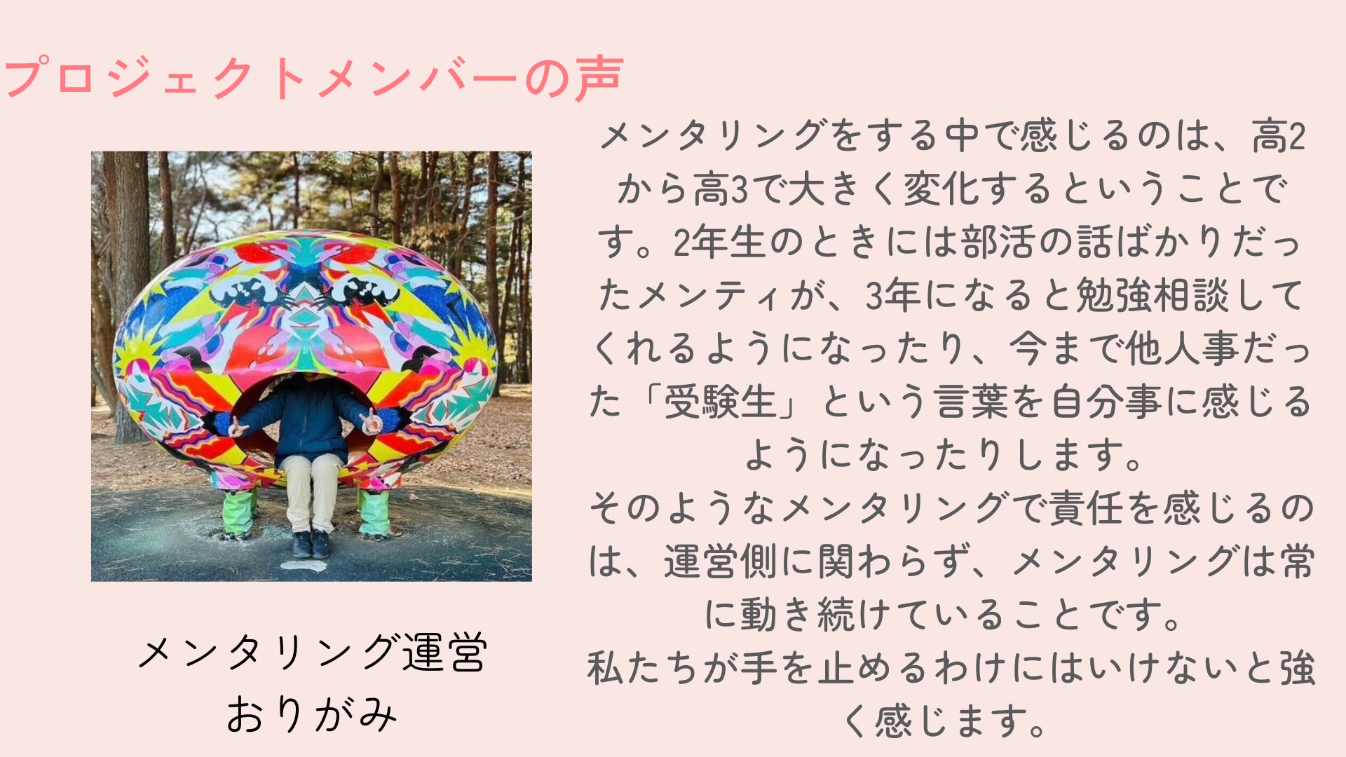 団体としてもNPO法人となっただけでなく、団体内部でも創設者二人の卒業や、新代表の誕生、新メンバーの加入などの代替わりが行われ、課題解決のために、持続的な活動が運営できる体制へと少しずつ移行しています。