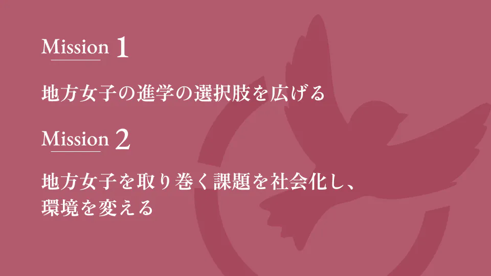 地元に縛られない進路選択を目指す地方女子は、周囲から反対されることが多いだけでなく、目標や指標とするべきロールモデルも少なく、進学が非常に困難になるケースが多くあります。これに課題意識を見出し、私たち#YCPは現状を改善すべく、NPO法人として高校生のビジョンを広げるメンタリング事業を中心に様々な事業を展開しています。