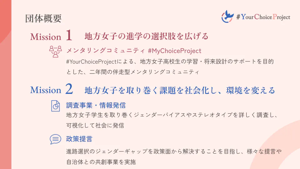 私たちは、そんな課題を解決したいと思い活動しているNPO法人#Yourchoiceprojectです。2021年より、以下の二つのミッションを掲げ活動しています。